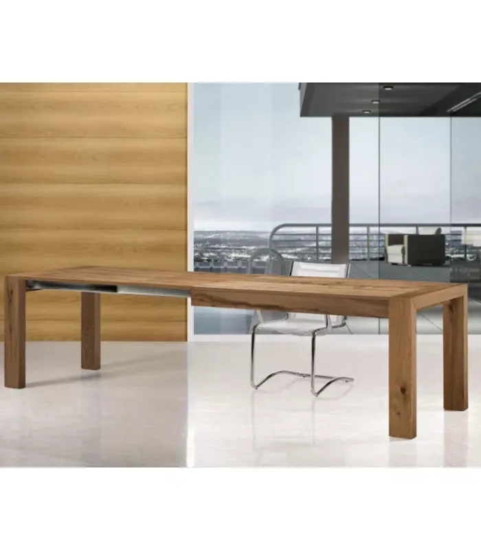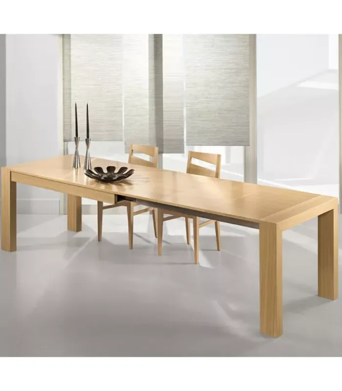 Tavolo allungabile impiallacciato su truciolare di pioppo. Gambe impiallacciate su lamellare. Sistema di apertura: guida telescopica in metallo a 3 prolunghe. Dimensioni: H 77 cm, spessore 2 cm, gambe rettangolari 13,5×7 cm.