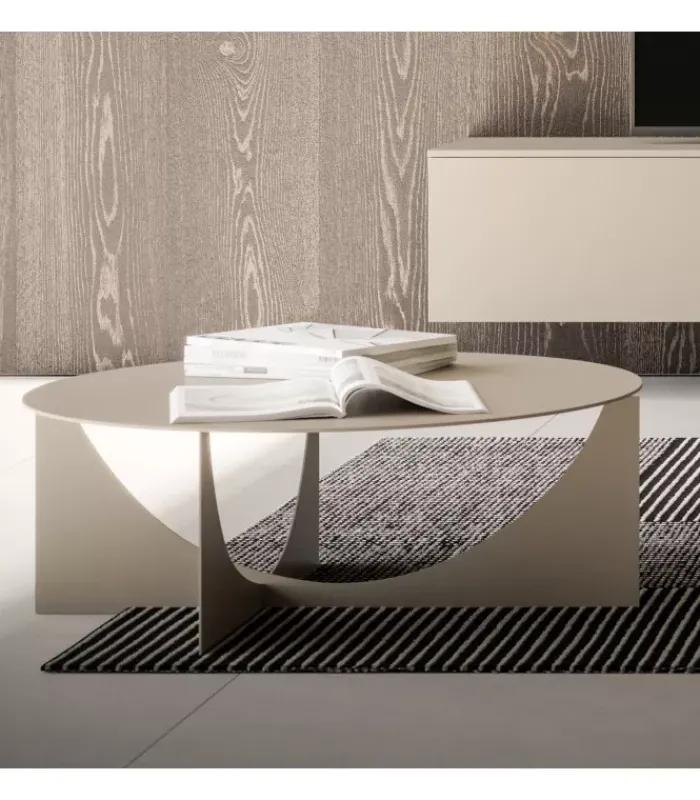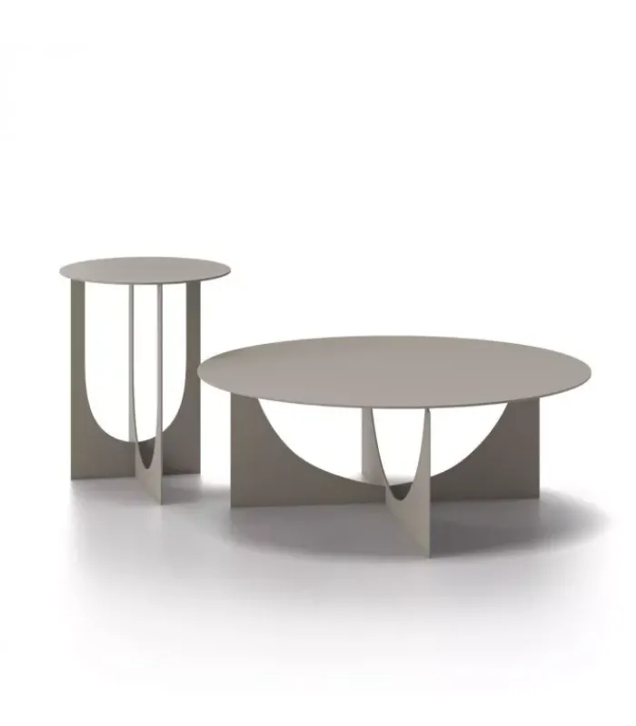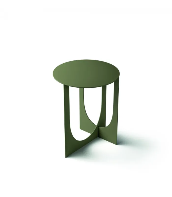 Un originale tavolino in lamiera con piano rotondo e struttura con taglio caratterizzante, per completare il tuo arredo con stile.