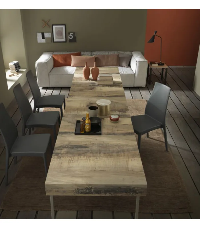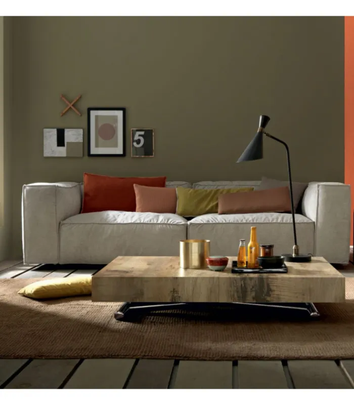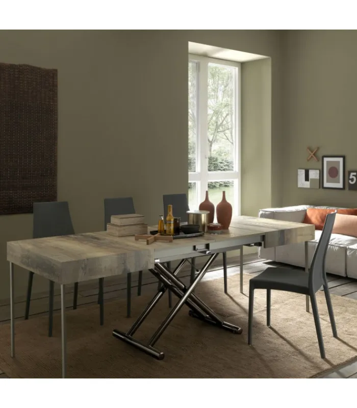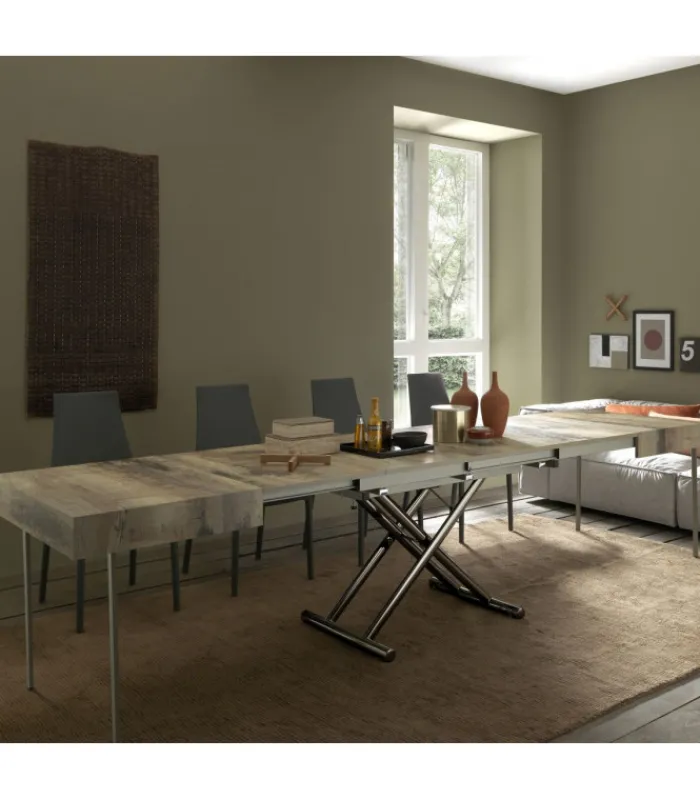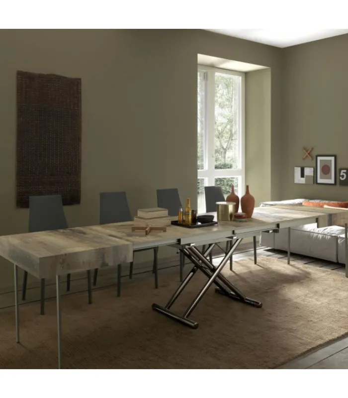 Tavolino trasformabile in tavolo da pranzo, base in metallo, meccanismo a gas, regolabile in altezza al millimetro da cm 25 a cm 76, piano rettangolare in nobilitato, laccato, legno o effetto malta, 2 prolunghe interne e 2 prolunghe esterne. Ruote a scomparsa. Gambe pieghevoli di supporto.