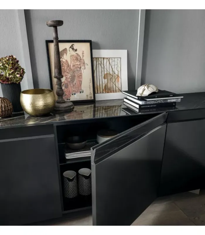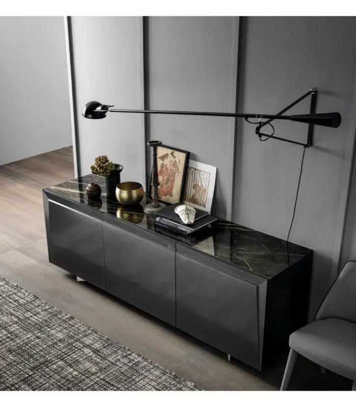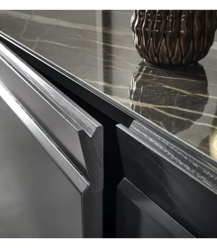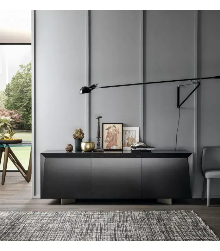 Madia laccata a 3 ante. Bordo superiore di porte in legno massello. Vassoio in ceramica. Tre ripiani interni in vetro trasparente. Nella combinazione di più elementi e materiali, Dama si esprime attraverso il disegno esclusivo dell’anta che gioca con le inclinazioni creando piacevoli effetti tridimensionali, eseguiti con maestria e rigore formale. La madia Dama si compone di tre ante laccate, mentre il profilo inclinato che indica l’apertura vive di un legno massello estremamente tattile. Al top una preziosa ceramica completa l’opera degna del suo nome.