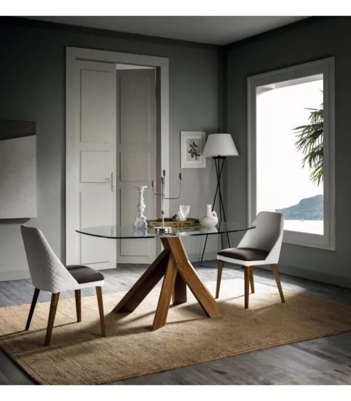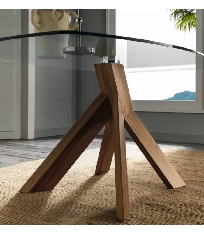 Tavolo con base a 4 gambe in legno o metallo verniciato a polvere. Piano sagomato a botte in vetro trasparente temperato.