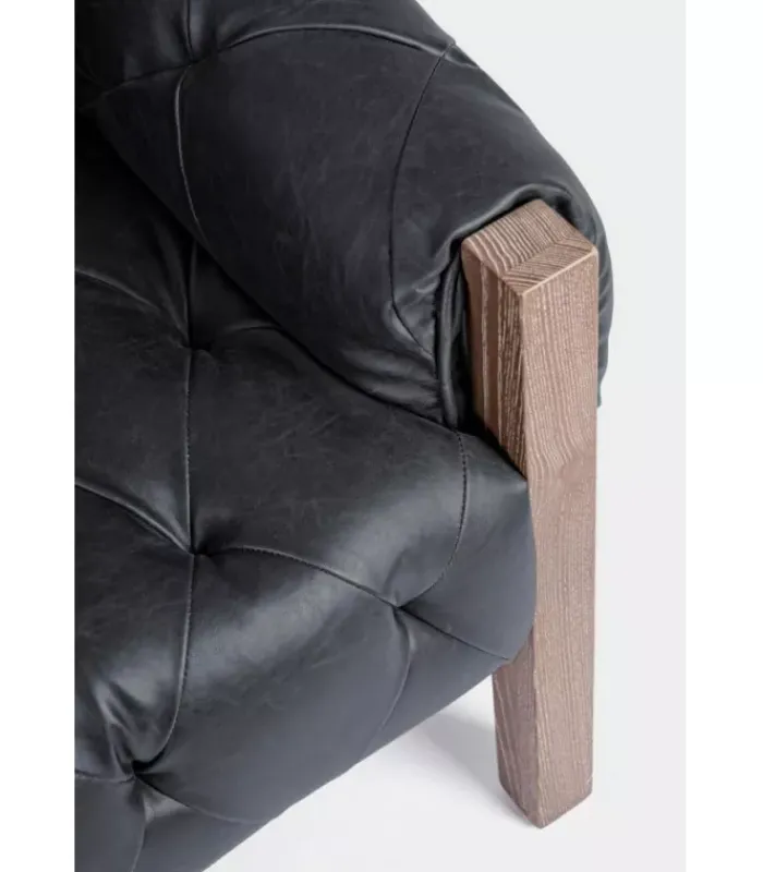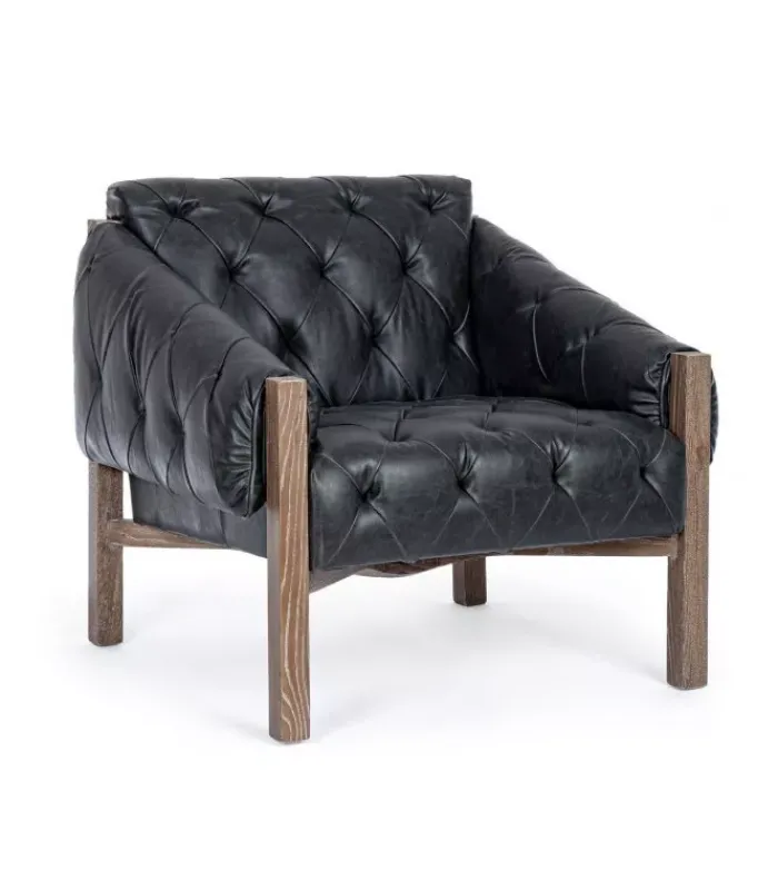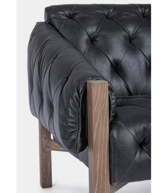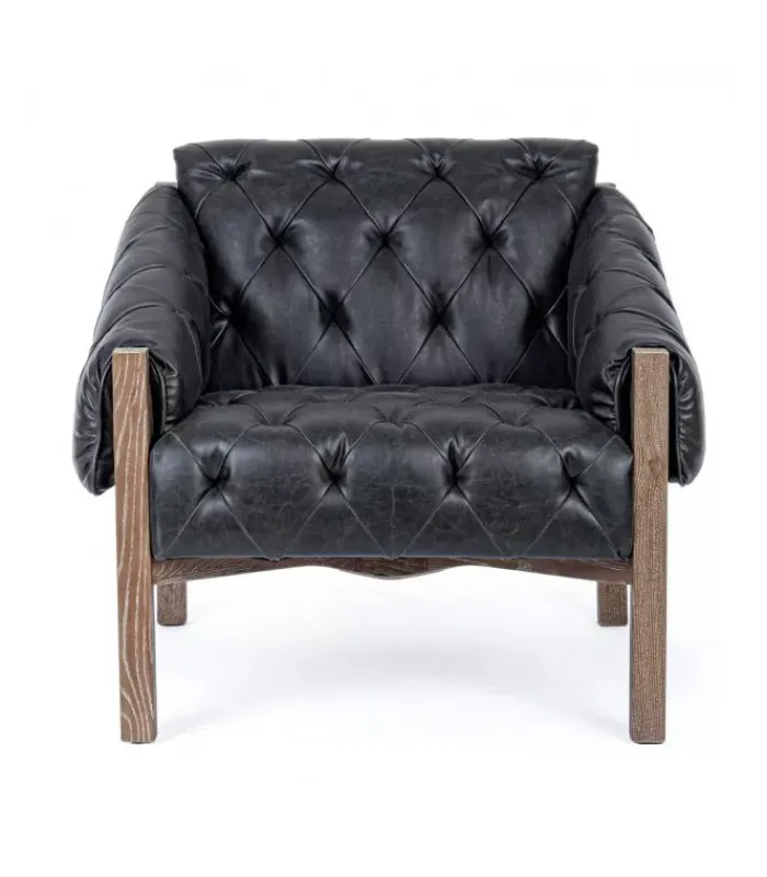 STRUTTURA IN LEGNO DI FRASSINO, RIVESTIMENTO IN SIMILPELLE (PU) E LAVORAZIONE A CAPITONNE’. DENSITA’ IMBOTTITURA IN SCHIUMA POLIURETANICA SEDUTA 30KG/M3, SCHIENALE 25KG/M3. – DIMENSIONI IN CM. 83.5 (L.) 81.5 (P.) 76 ( H.) 44.5 ( H1) – 60 ( H2)