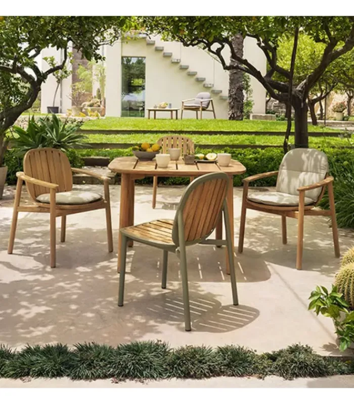 Trattandosi di un materiale naturale, si potrebbero osservare variazioni di colore tra un prodotto e l’altro o tra i componenti di uno stesso prodotto. In caso di bruschi cambiamenti di temperatura e in base al tasso di umidità, inoltre, potrebbero verificarsi anche delle crepe. Se non sottoposto ad alcun trattamento di manutenzione tramite l’applicazione periodica di comuni e specifici protettivi a base olio, la superficie prenderà una patina grigio argento che può essere eliminata anche con una leggera carteggiatura superficiale e successiva lucidatura con panno di iuta. Piccole macchie superficiali dovute a olio o altri prodotti alimentari devono essere rimosse tempestivamente, prima che il legno possa assorbirle in profondità, carteggiando la superficie interessata e lucidando con un panno di iuta. Macchie da caffè, spremute, bevande naturali, senza aggiunte di conservanti, possono essere rimosse tempestivamente con acqua e un panno morbido. Quando il legno si bagna per la prima volta è normale che la superficie diventi un poco ruvida e, una volta asciutta, la levigatura iniziale può essere ripristinata con una leggera carteggiatura superficiale e successiva lucidatura con panno di iuta. Il teak è un materiale naturale che assorbe l’acqua ed è ricco di olii. Con il passare del tempo, questi olii, per un processo naturale, risalgono in superficie e possono macchiare eventuali cuscini che sono stati utilizzati. Le macchie sui cuscini possono essere rimosse utilizzando acqua e sapone.
