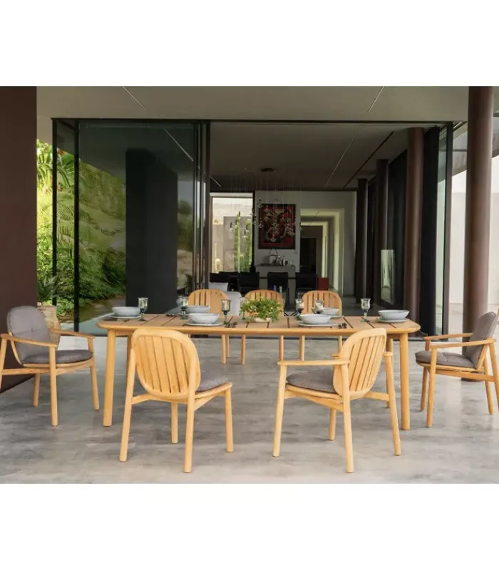 È interamente realizzata in teak. È accessoriabile di cuscino sia per la seduta che per lo schienale. È venduta in stock da 2 sedie ed è impilabile, per un massimo di due sedie impilate.