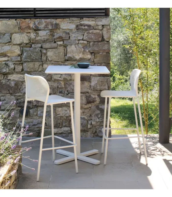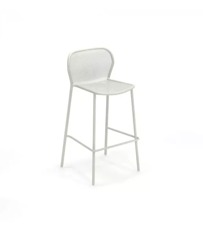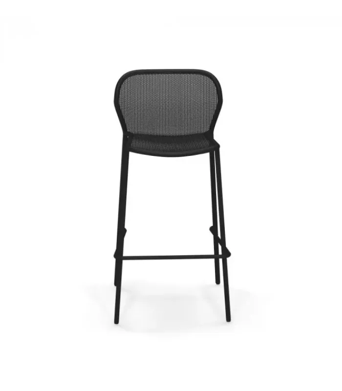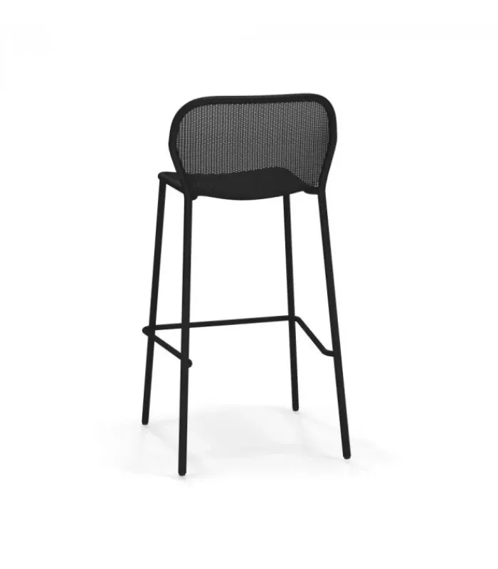 Sgabello con struttura in acciaio verniciato, la seduta e lo schienale sono in lamiera stirata pre zincata a caldo e verniciata.