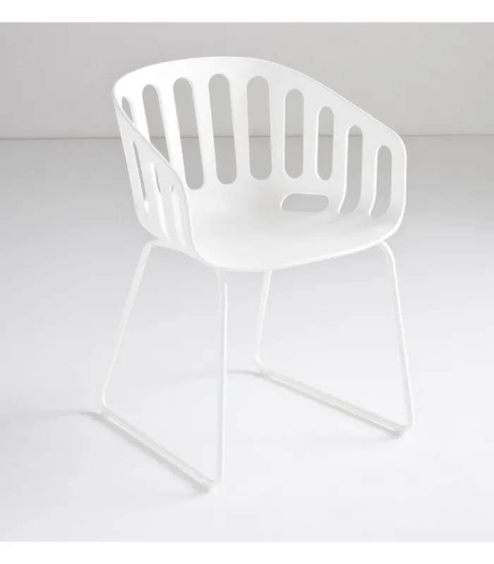 Sedia BASKET ST con struttura a slitta, cromata o verniciata bianca, scocca in tecnopolimero. La seduta è disponibile in 6 diversi colori.