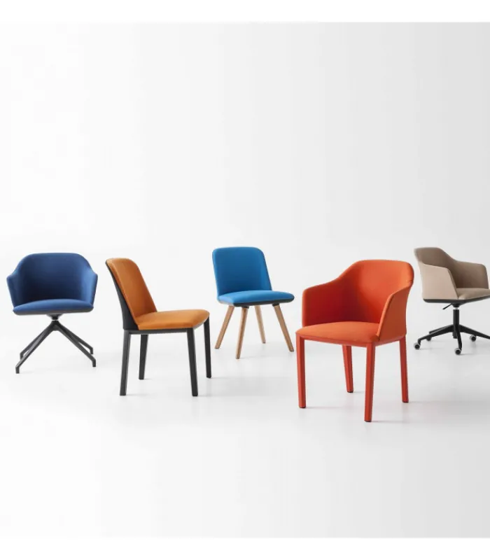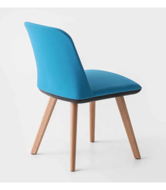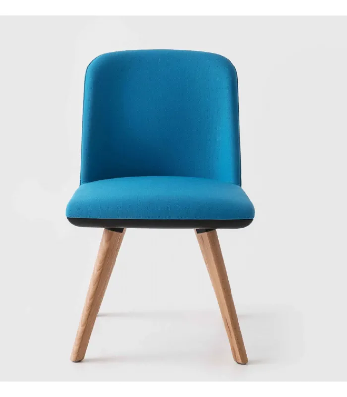 Poltroncina MANAA SLIM BL imbottita e rivestita (disponibile in 6 diversi tessuti). La struttura a 4 gambe è in legno di faggio (disponibile in 2 colori).