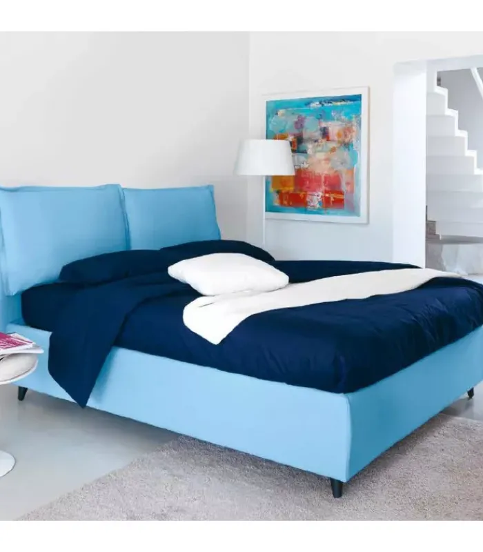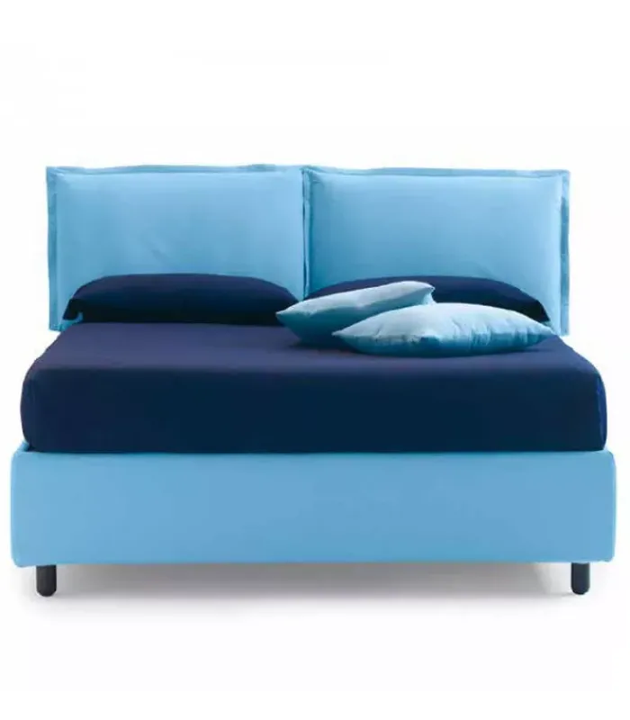 Letto VERA ADVANCE AIR imbottito e rivestito di tessuti sfoderabili. È disponibile con o senza contenitore (la versione con contenitore è disponibile con l’alzata totale o parziale della rete), la rete è ortopedica a 14 doghe in betulla. I piedini li puoi scegliere in legno o in polipropilene, acquistabili in molte dimensioni e forme e molti colori. Nella versione da una piazza e nella versione da 120 è realizzato con un solo cuscino.