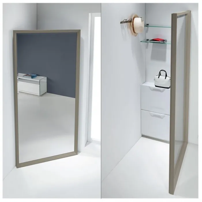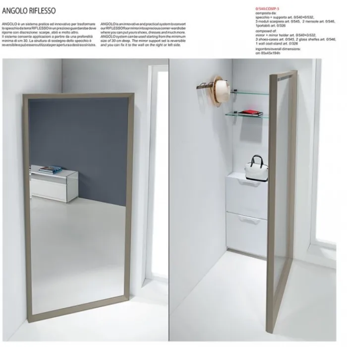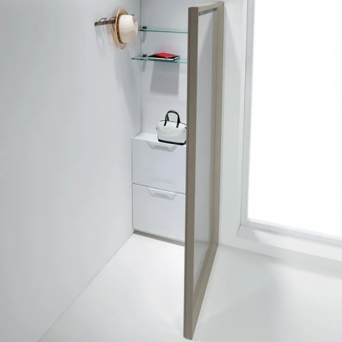 Il suo specchio con cornice in alluminio verniciato sablè aggiunge un tocco di raffinatezza e modernità, mentre le scarpiere dal colore bianco donano luminosità e pulizia visiva all’ambiente. Realizzato con la massima cura artigianale in Italia, questo angolo composizione è disponibile in varie finiture per soddisfare ogni esigenza di stile e design.
