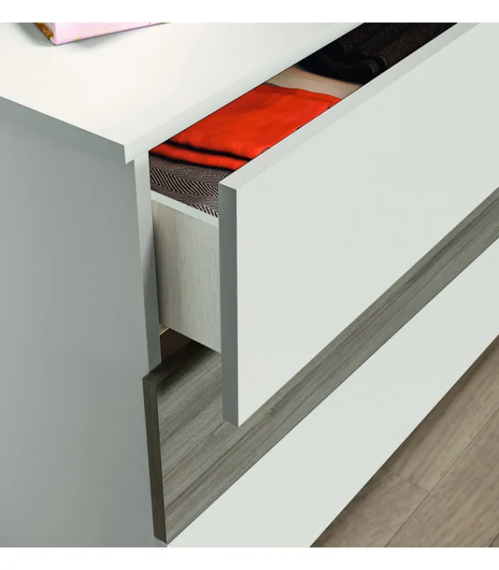 I frontali del comò, sono caratterizzati dalla forma irregolare, motivo che ricorre anche sui comodini e settimanali della stessa collezione.