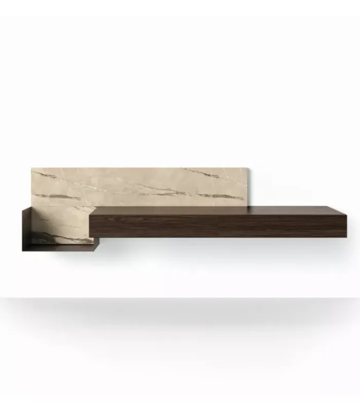 La mensola in metallo, posizionata strategicamente, aggiunge un elemento moderno e industriale, donando un carattere unico a questo pezzo d’arredamento.