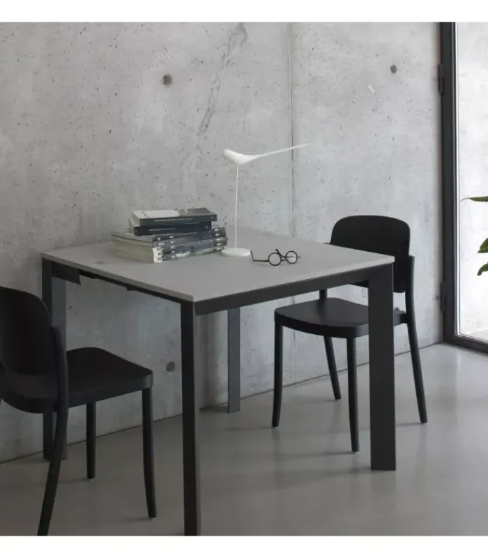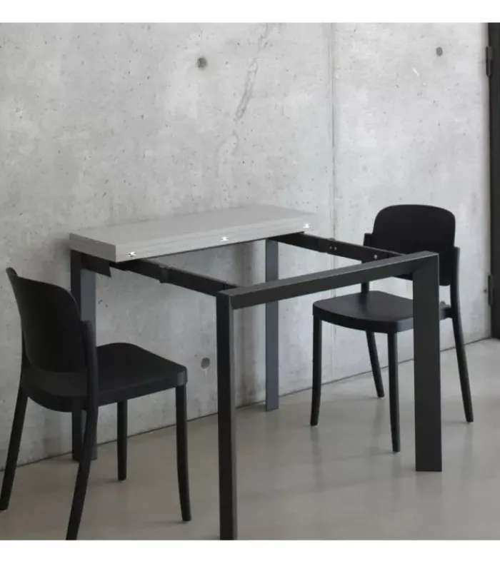 Il piano del tavolo è realizzato in nobilitato, garantendo un aspetto raffinato e resistente che si adatta perfettamente a uno stile moderno. La struttura in metallo conferisce stabilità e durabilità al tavolo, mentre il design complessivo è una sintesi di eleganza e praticità.