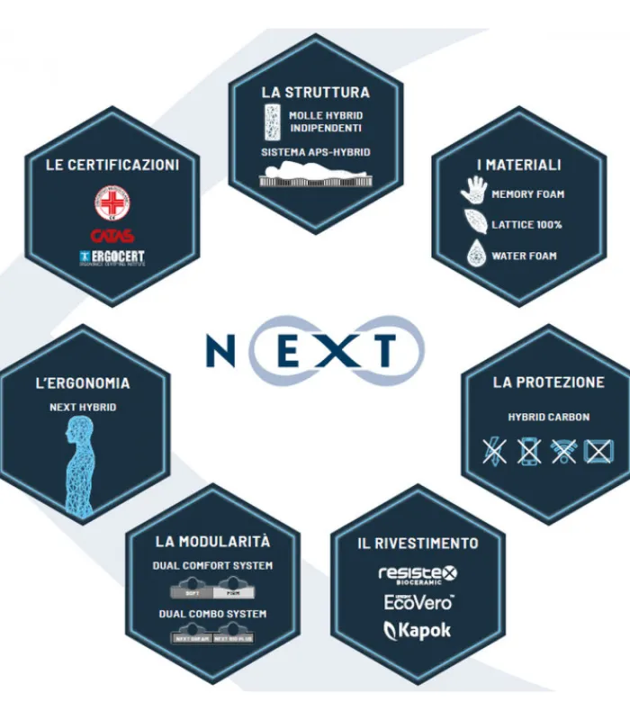 - La tecnologia delle molle Hybrid permette un’ergonomia reattiva su 7 zone differenziate, adattandosi alle diverse pressioni del corpo per un comfort ottimale.