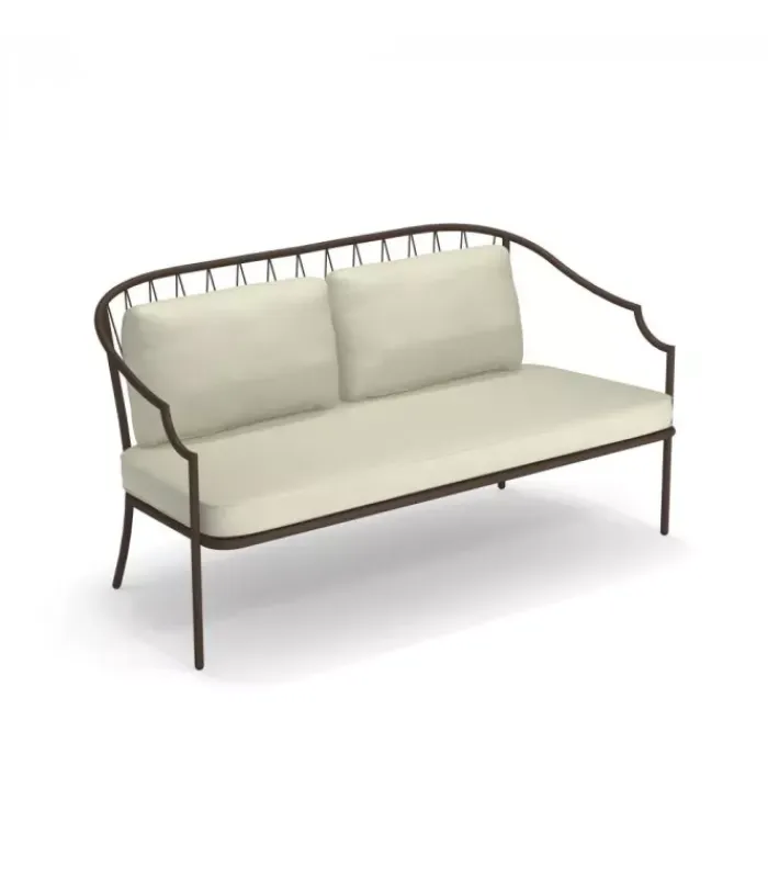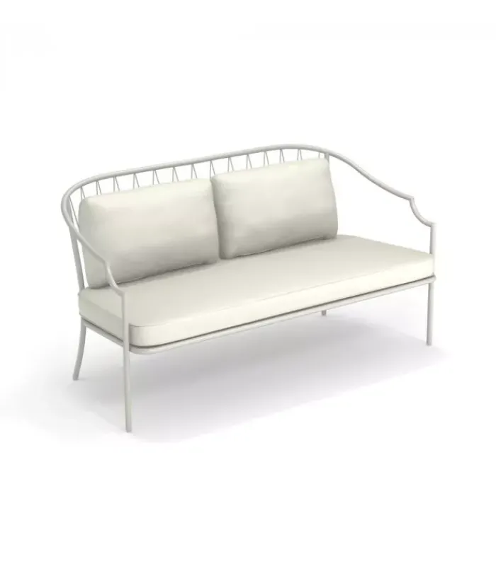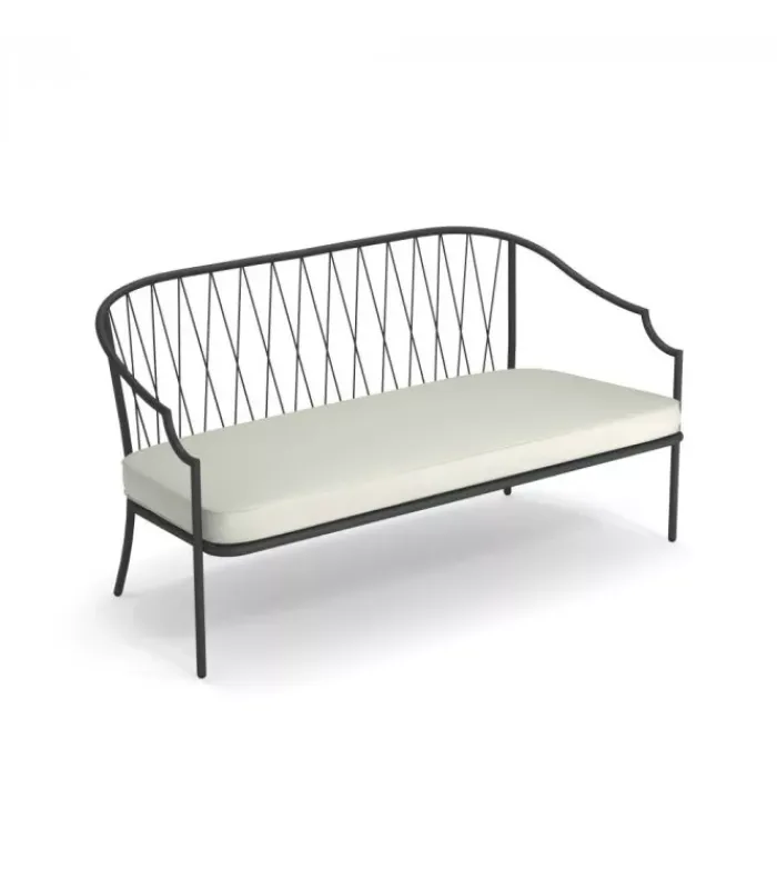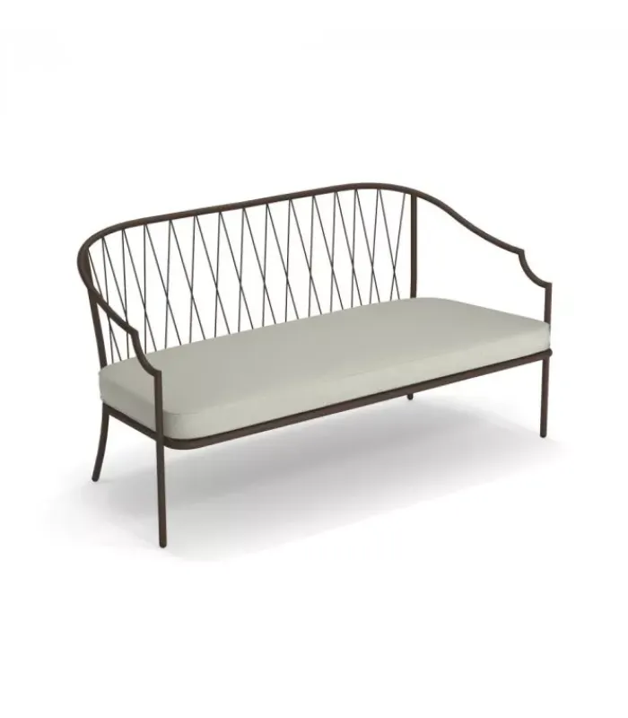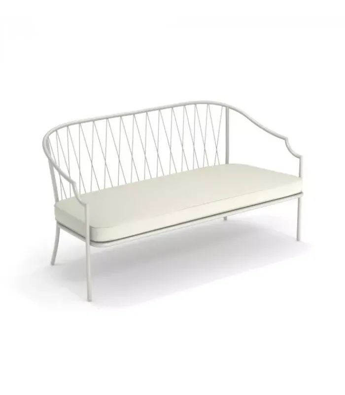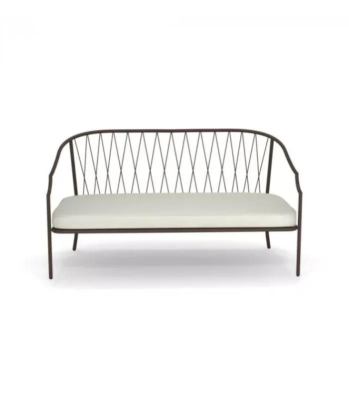 Divano con struttura in acciaio verniciato, la seduta è in lamiera stirata pre zincata a caldo e verniciata, lo schienale è in acciaio a tondini pre zincato a caldo. È accessoriabile di cuscino per lo schienale ed è dotato di cuscino per la seduta, disponibile in molti tessuti e molti colori.