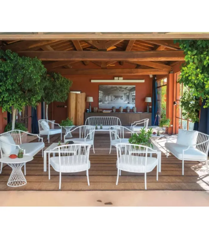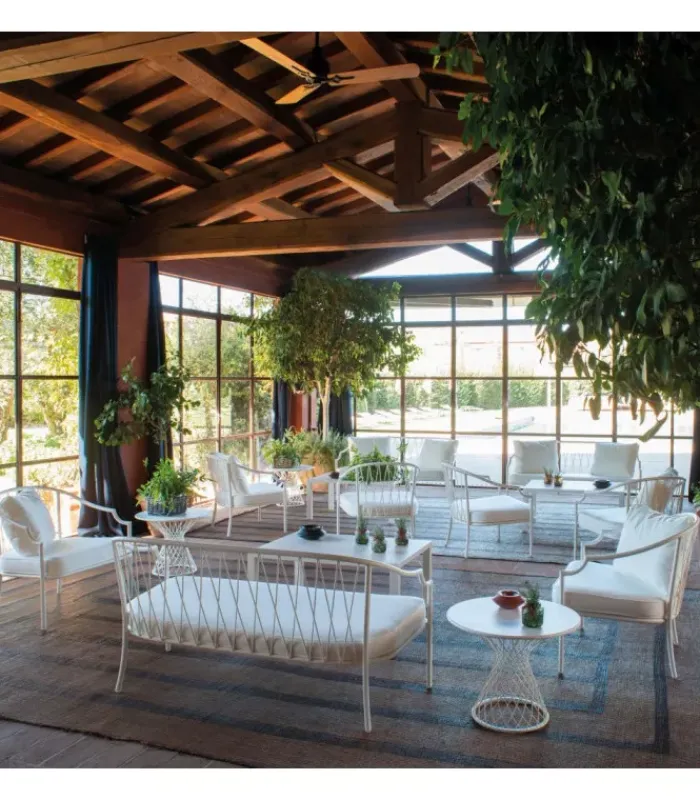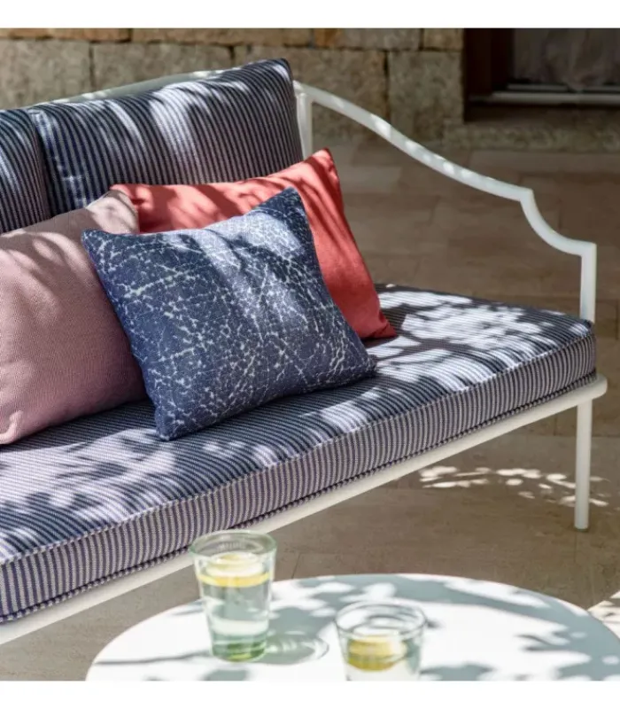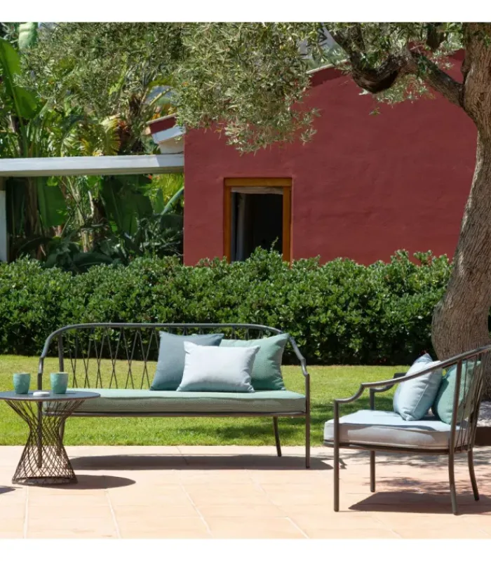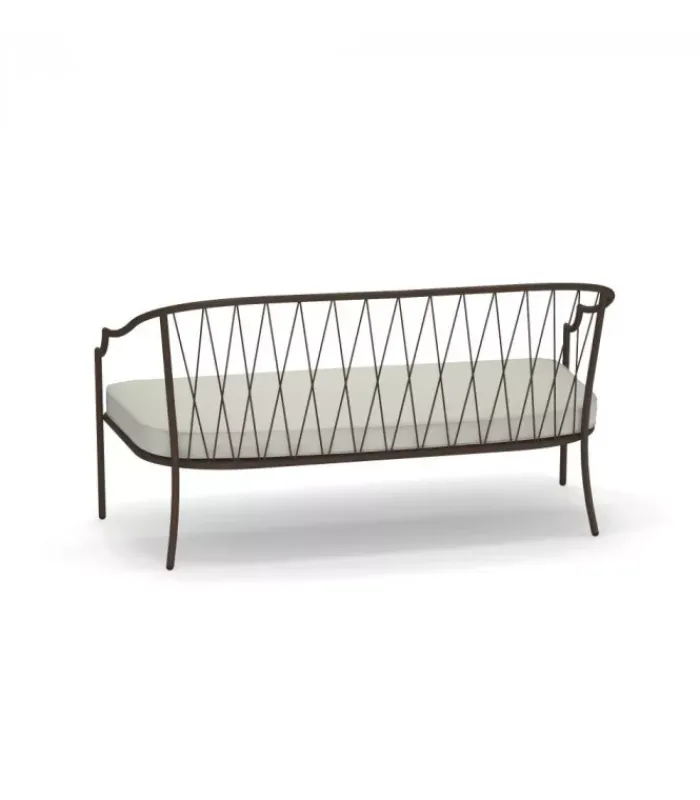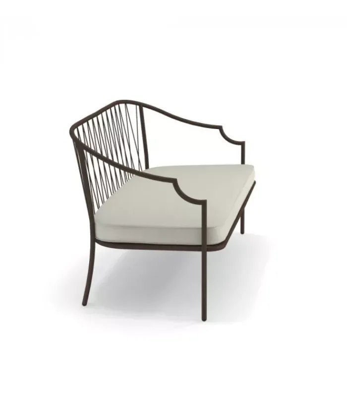 Divano con struttura in acciaio verniciato, la seduta è in lamiera stirata pre zincata a caldo e verniciata, lo schienale è in acciaio a tondini pre zincato a caldo. È accessoriabile di cuscino per lo schienale ed è dotato di cuscino per la seduta, disponibile in molti tessuti e molti colori.