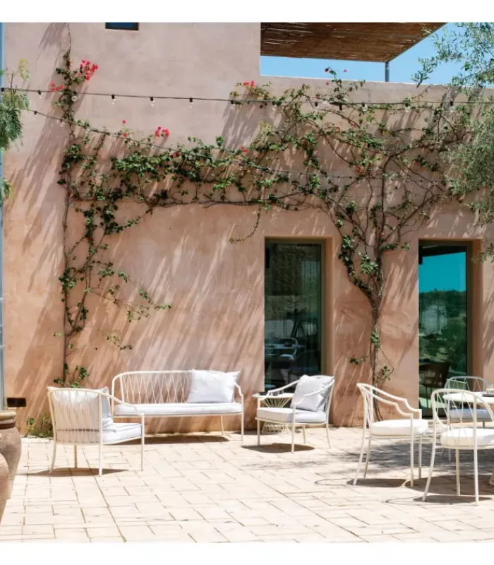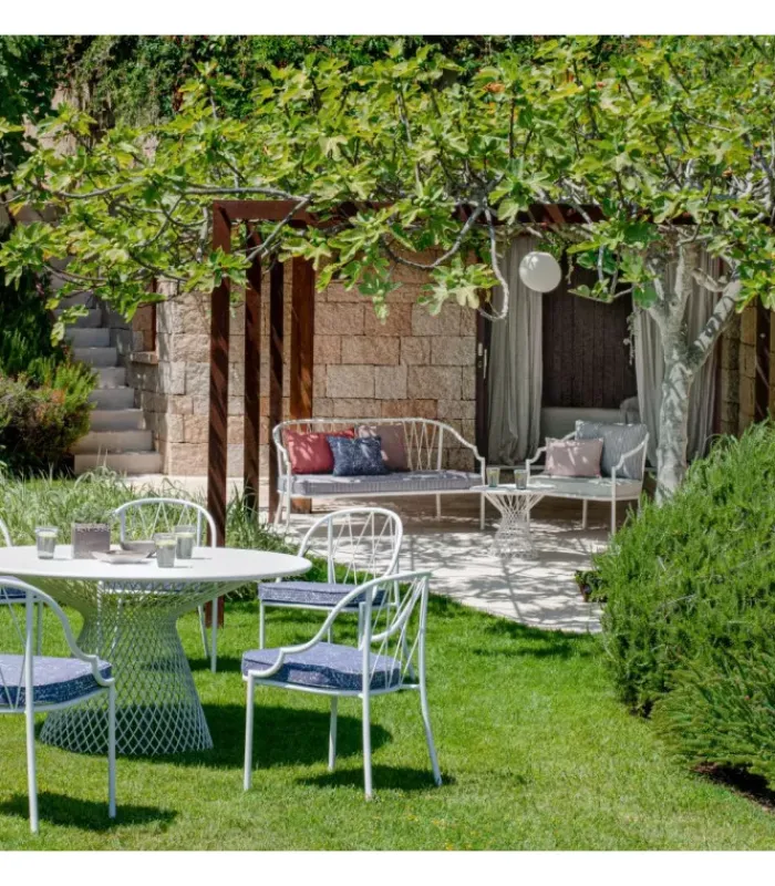 Como è una collezione completa di sedute e tavoli composta da sedia e poltroncina dining, poltroncina dining con schienale alto, poltrona, divano, tavolo dining e tavolo basso. La struttura delle sedute è in tubo di acciaio diametro 22, con spessore 2mm per un elevato livello di performance outdoor. Alla struttura sono connessi dei tondini di acciaio che costituiscono il motivo decorativo dello schienale: questi tondini sono saldati tramite una tecnologia a proiezione, che permette la fusione dei tondini in maniera tecnicamente più pulita, con un effetto estetico più rifinito e conseguentemente minor rischio di ruggine. La lamiera stirata del sedile è zincata a caldo per un’elevata resistenza in ambienti outdoor ed è anch’essa saldata alla struttura attraverso la tecnica a proiezione sopracitata. Come tutti i prodotti EMU in acciaio, è previsto un pretrattamento di cataforesi e successivamente un trattamento di verniciatura con polvere termoindurente, che conferisce al prodotto uno strato di vernice con spessore omogeneo con un alto grado di aderenza e resistenza. La presenza dei sottopiedi in nylon supporta la facilità di spostamento e di protezione delle estremità del prodotto.