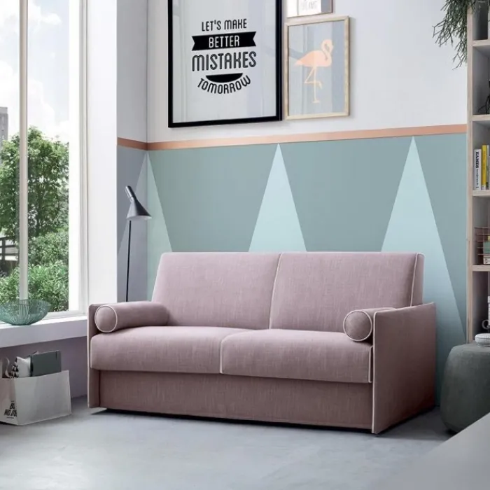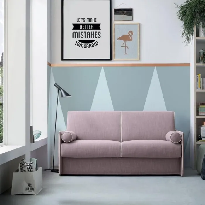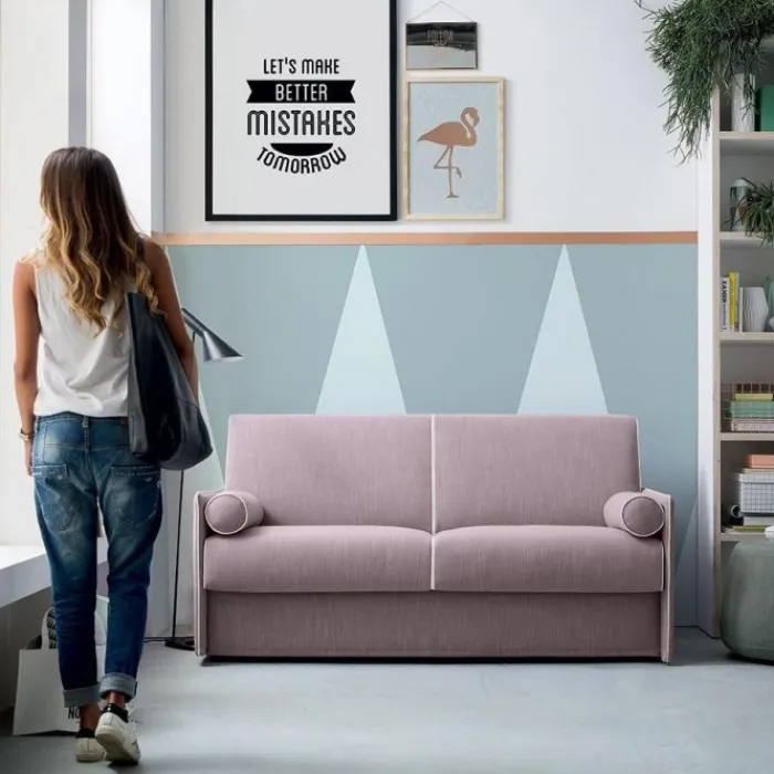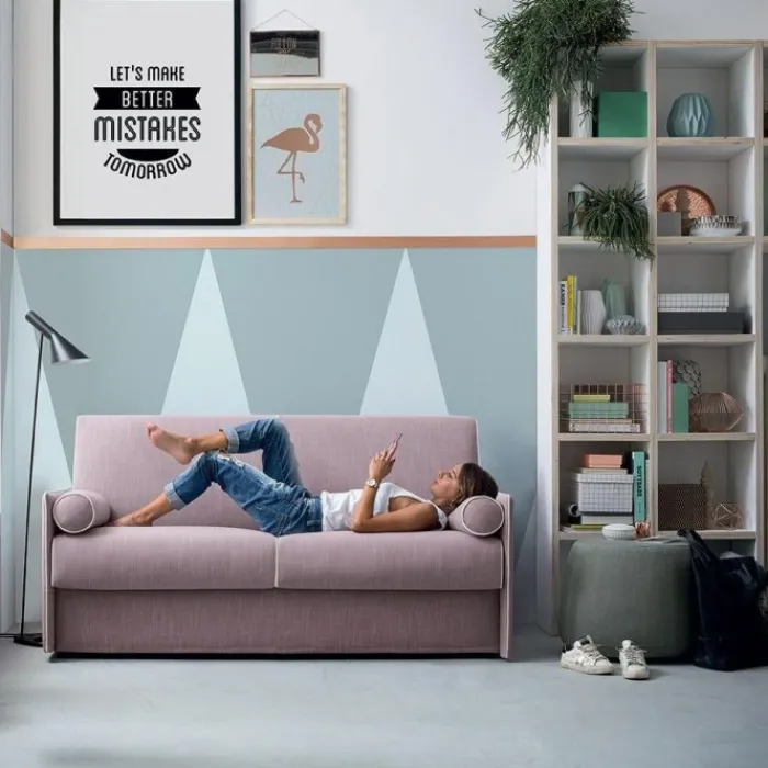 Riduce al minimo gli ingombri in larghezza, grazie ai braccioli di soli 4 cm. di spessore ed è la soluzione ideale per chi cerca un divano comodo ed elgante ma non vuole rinunciare ad un comodo letto fatto su misura per le proprie esigenze, grazie ad una vasta gamma di materassi abbinabili.