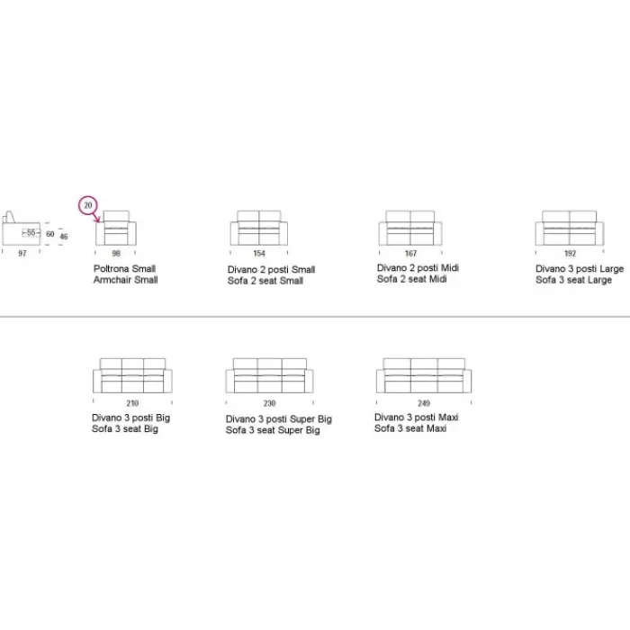 - IMBOTTITURA – Cuscino di seduta in espanso indeformabile D30, rivestito con ovatta di fibra di poliestere. Cuscino schienale e poggiareni in espanso indeformabile D16 morbido, rivestito in 100% resinato da 150 gr. Bracciolo in espanso indeformabile D30.