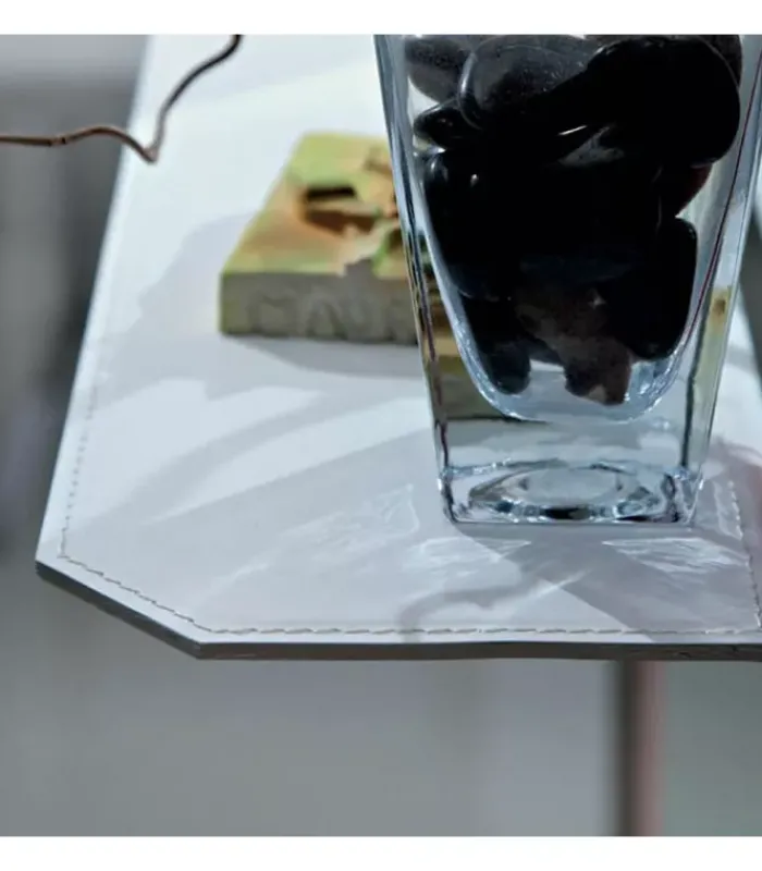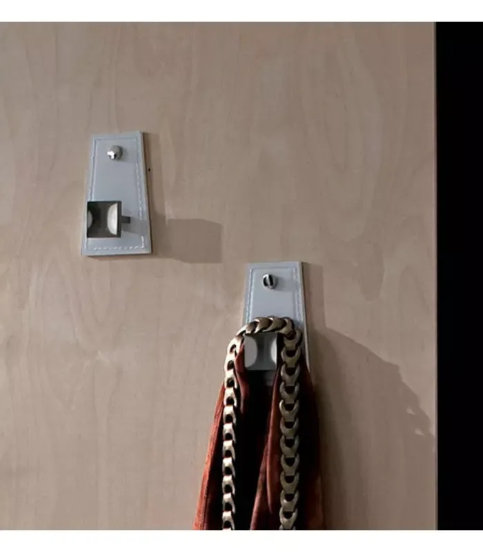 Specchio centrale montato su pannello melaminico di spessore 4mm con fasce laterali in vetro laccato da 3mm, mensola in metallo rivestito in cuoio rigenerato, appendini in metallo rivestito in cuoio rigenerato.