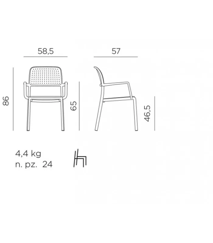BORA, sedia impilabile con braccioli in polipropilene per indoor ed outdoor, con piedini antiscivolo.
