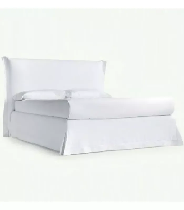 Letto CHLOÈ con piedini in legno nascosti dalla mantovana del giroletto, il tessuto di rivestimento è sfoderabile. È disponibile con o senza contenitore, la versione con contenitore prevede 4 diverse modalità di alzata della rete (ortopedica a 14 doghe in betulla da 65 mm).