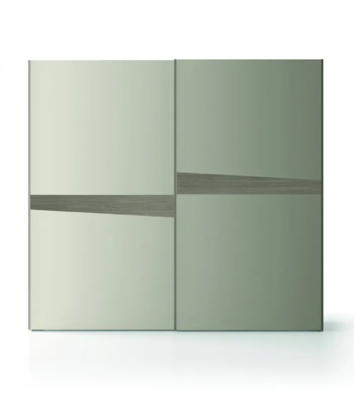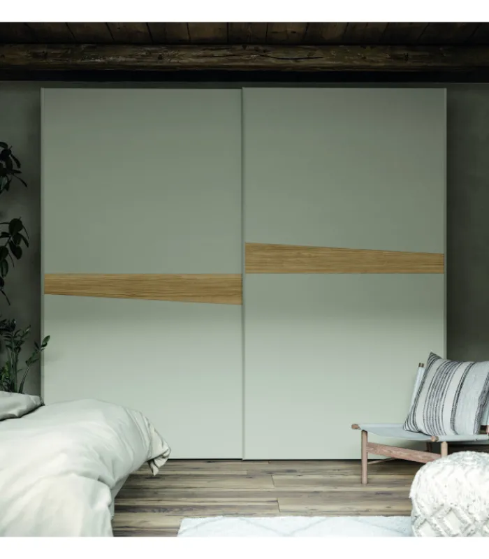 L’uniformità delle ante scorrevoli viene interrotta da un inserto asimmetrico orizzontale, disponibile in diverse finiture per dare carattere a uno stile dai tratti semplici.