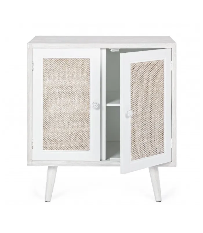 STRUTTURA E PIEDINI (DA ASSEMBLARE) IN LEGNO DI PINO. SCHIENALI, LATERALI ED ANTE IN MDF. FRONTALE ANTE RIVESTITO IN TESSUTO (COTONE/LINO). FINITURA CON VERNICE A BASE D’ACQUA. POMELLI IN METALLO.