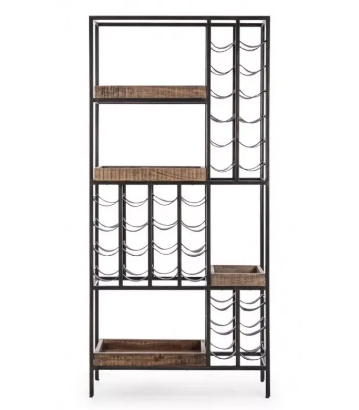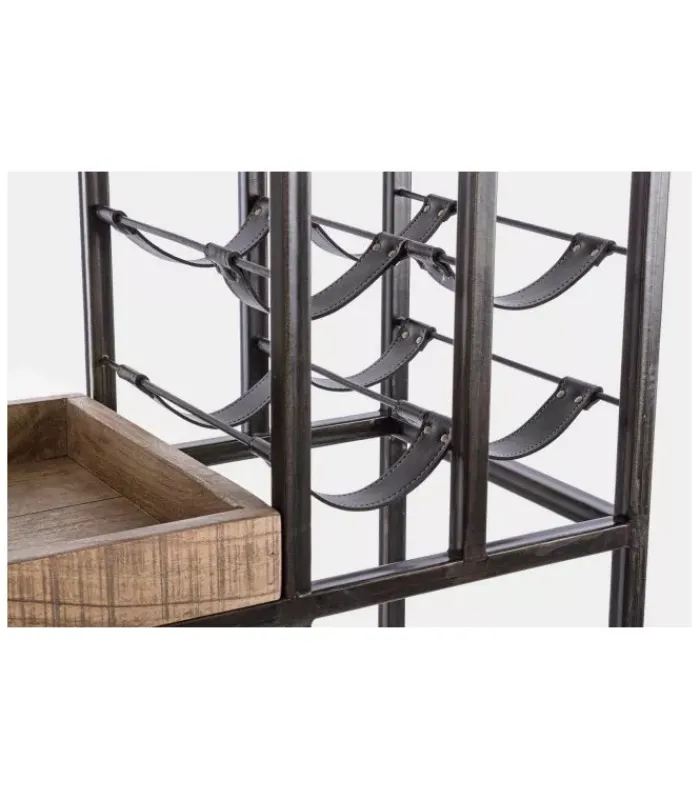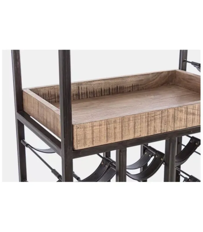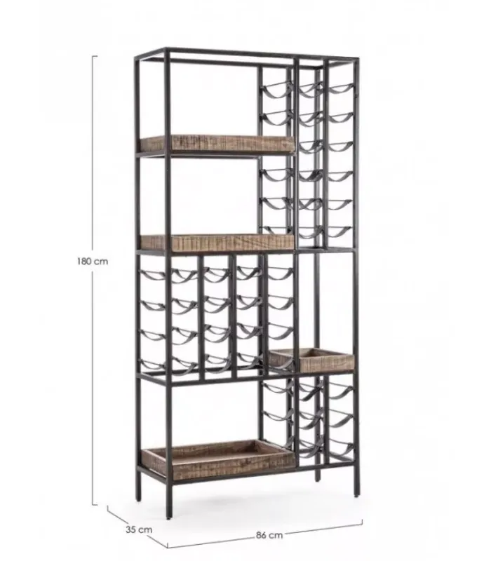 STRUTTURA IN ACCIAIO VERNICIATO A POLVERE EPOSSIDICA. PIANI IN LEGNO D’ACACIA. FINITURA ACRILICA PROTETTIVA. PORTA BOTTIGLIE IN SIMILPELLE (PU). – DIMENSIONI IN CM. 86 (L.) 35 (P.) 180 H