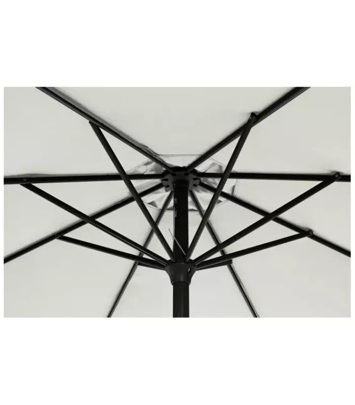 STRUTTURA VERNICIATA A POLVERE (POLIESTERE). PALO IN ALLUMINIO Ø46/48MM. 8 STECCHE IN ACCIAIO TRATTATO PER ESTERNO TRAMITE FOSFATAZIONE 12x18MM. TELO IN POLIESTERE COLOR NATURALE 180GR/M2 CON CAMINO ANTIVENTO. BASE NON INCLUSA – DIMENSIONI IN CM. Ø300 (L.) 242 H