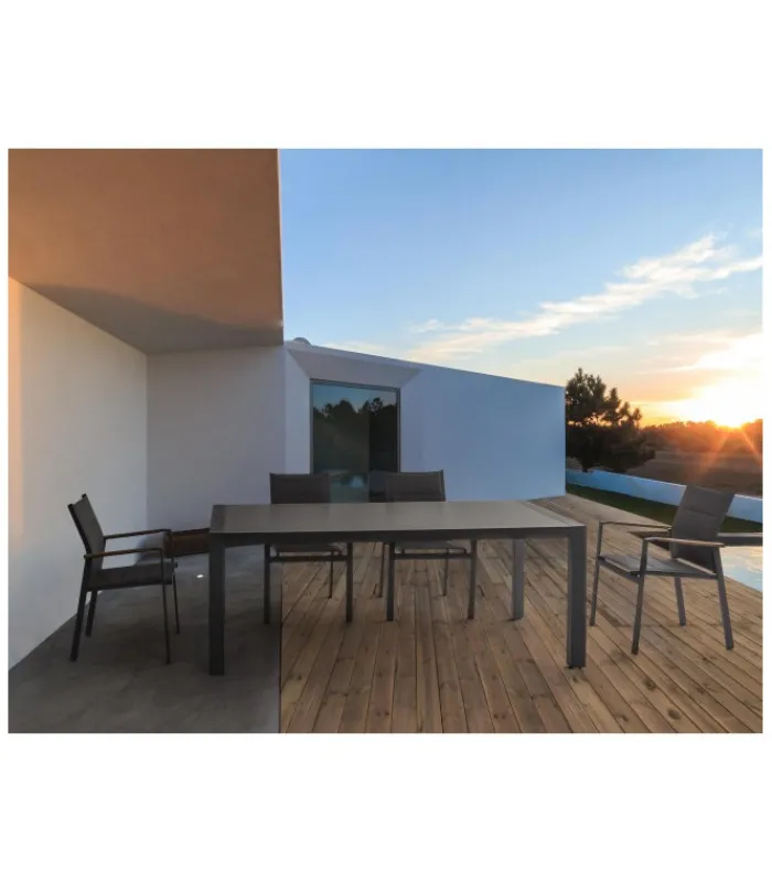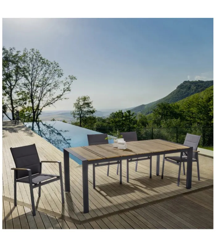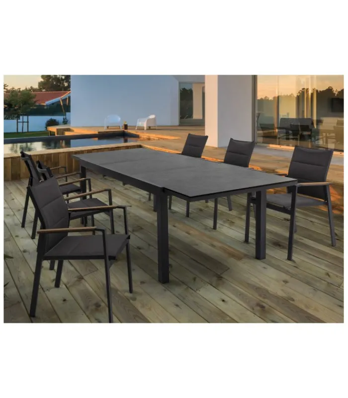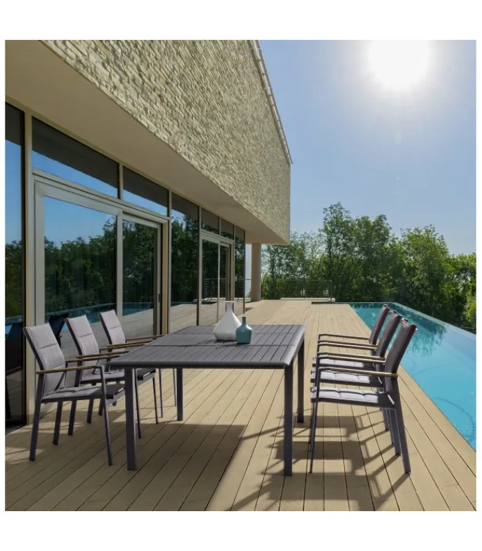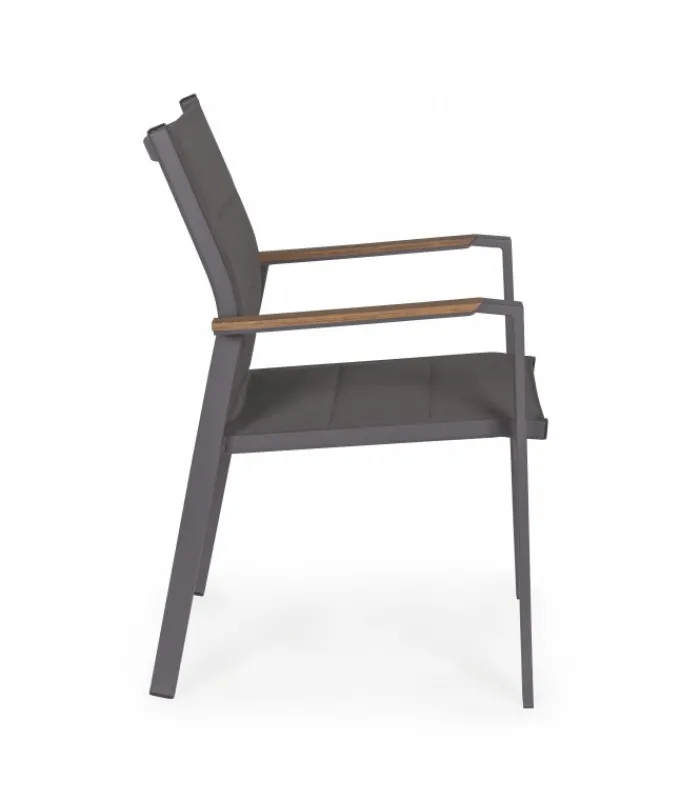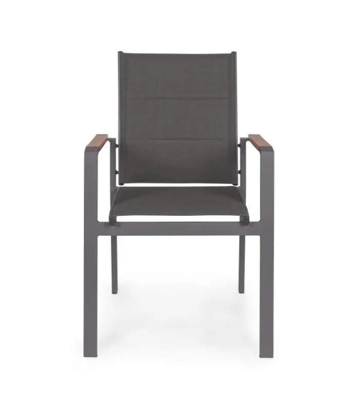 STRUTTURA IN ALLUMINIO, VERNICIATO A POLVERE (POLIESTERE). BRACCIOLI CON INSERTI IN POLYWOOD. RIVESTIMENTO SEDUTA E SCHIENALE IN TEXTILENE 2X2 (CON IMBOTTITURA). IMPILABILE.
