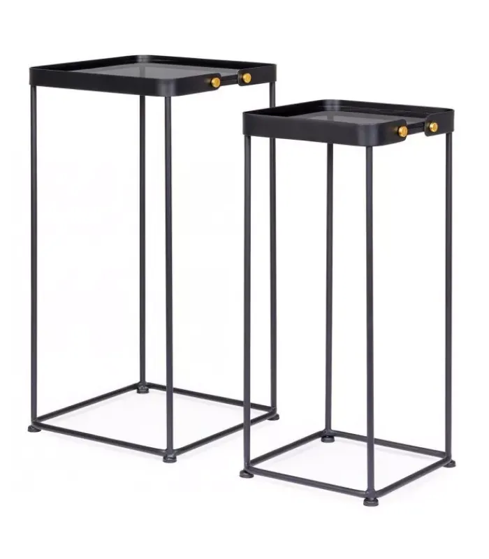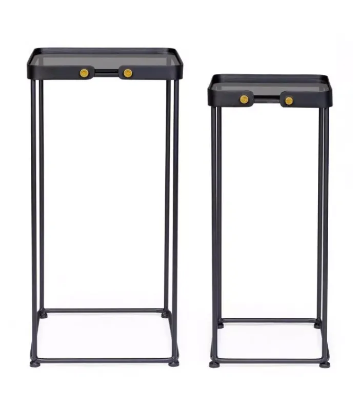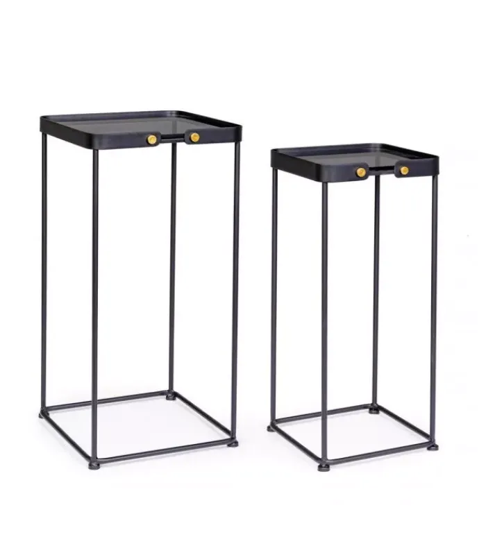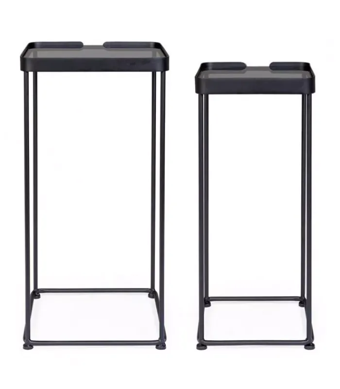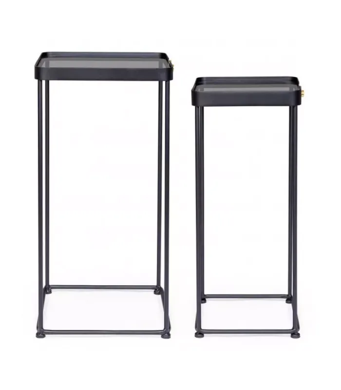 STRUTTURA IN ACCIAIO, VERNICIATA A POLVERE EPOSSIDICA. PIANO IN VETRO TEMPERATO. – DIMENSIONI IN CM. 26 (L.) 25 (P.) 58.5 H; 32 (L.) 31 (P.) 63.5 H