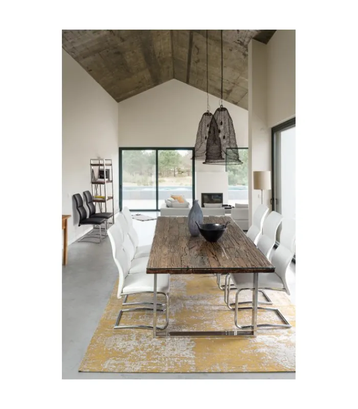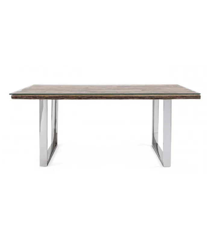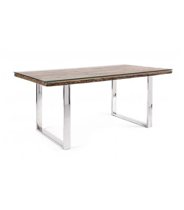 Piano in legno riciclato- finitura naturale- vetro temperato- gambe in acciaio inossidabile- essendo un piano in legno riciclato con tavole non levigate comporta una non perfetta adesione tra piano e vetro- gambe da assemblare.