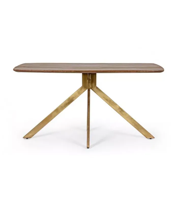 PIANO IN LEGNO DI MANGO CON FINITURA A BASE D’ACQUA. GAMBE IN ACCIAIO CON FINITURA PLACCATA OTTONE. GAMBE DA ASSEMBLARE. – DIMENSIONI IN CM. 150 (L.) 90 (P.) 76 H