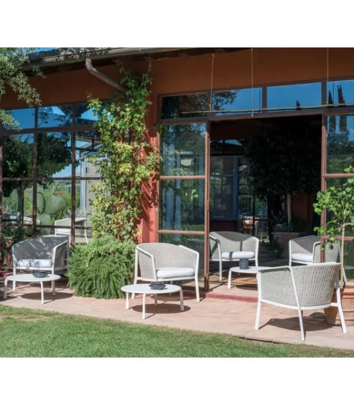 È realizzata con la struttura in alluminio verniciato, la scocca è realizzata in corda sintetica. È disponibile in 4 abbinamenti di colori, come nelle foto. Il cuscino è disponibile in molti colori.