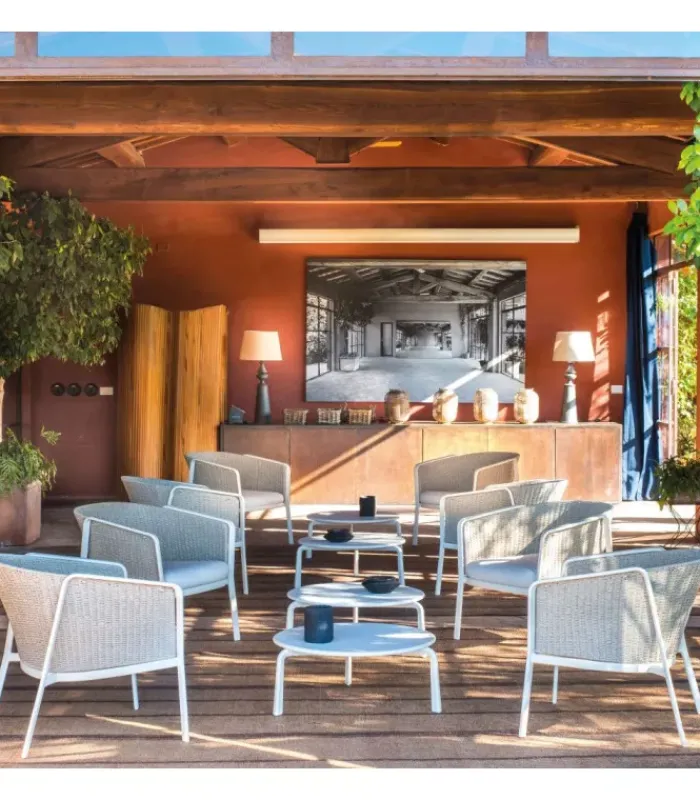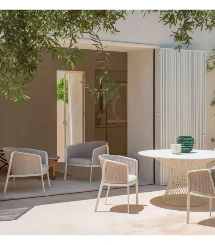 La collezione Carousel si compone di quattro versioni di poltroncina dining, tre versioni di poltrona lounge, divano, pouf, coffee table quadrato e rettangolare. Nelle sedute, la struttura a cavalletto è in tubolare di alluminio. Il sedile, costituito da una lamiera in lega di alluminio che viene imbutita per conferire una forma pulita, é successivamente fissato alla struttura di alluminio attraverso una saldatura di tipo strutturale, eseguita con tecnologia TIG che conferisce particolare resistenza oltre che un miglior standard a livello estetico. La struttura dello schienale è in acciaio ed è il supporto su cui sono realizzati gli intrecci decorativi nei vari materiali proposti. Tutti i materiali selezionati garantiscono una resistenza e una stabilità del colore. Per la poltroncina dining è prevista una versione in tessuto tecnico quale propilene in fibra Fiber Fill, con cui viene realizzato un cuscino sedile e uno schienale autoportante. Questi materiali garantiscono idrorepellenza, per questo il prodotto è particolarmente idoneo in tutti gli usi di ambienti marini e in condizioni climatiche estreme. I pouf hanno una struttura in tubolare ovale di alluminio mentre i tavoli hanno una struttura in tondino di acciaio con piano in lega di alluminio e sottopiedi regolabili in nylon e vite inox. Tutti decorati con intreccio di corda.