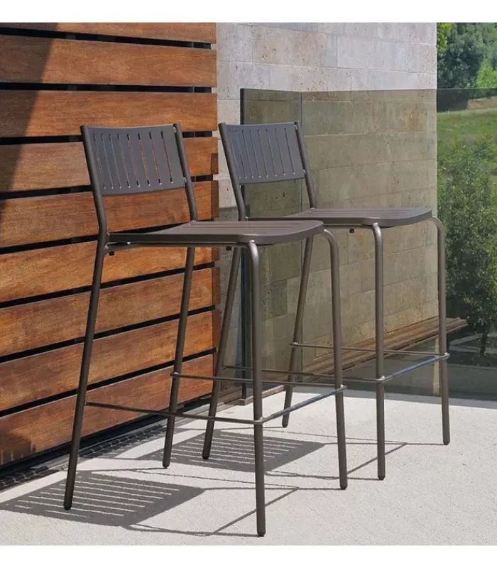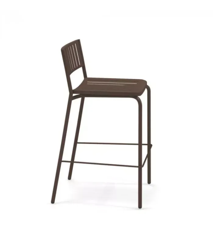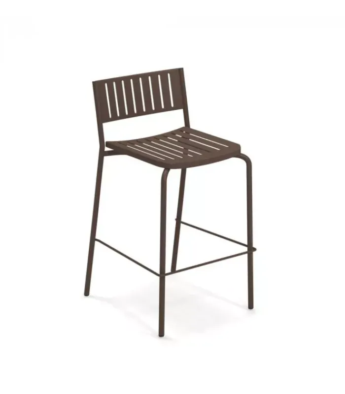 È accessoriabile di un cuscino in poliestere per la seduta, la struttura è in acciaio verniciato, la seduta e lo schienale sono in lamiera pre zincata a caldo e verniciata. È impilabile, per un massimo di 8 sgabelli impilati, ed è venduto in stock da 4 pezzi.