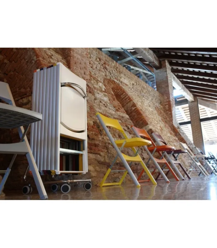 COMPACT è adatta anche all’uso per esterni, può essere accessoriata con pratici carrelli per facilitarne il trasporto fino a 7 sedie. Oppure con pratici ganci per riporre le sedie in linea, fino a 4 pezzi, nel caso di sale conferenze o meetings rooms.