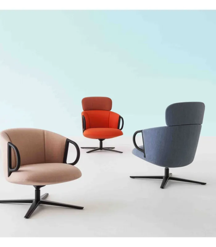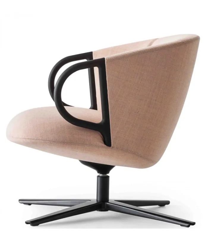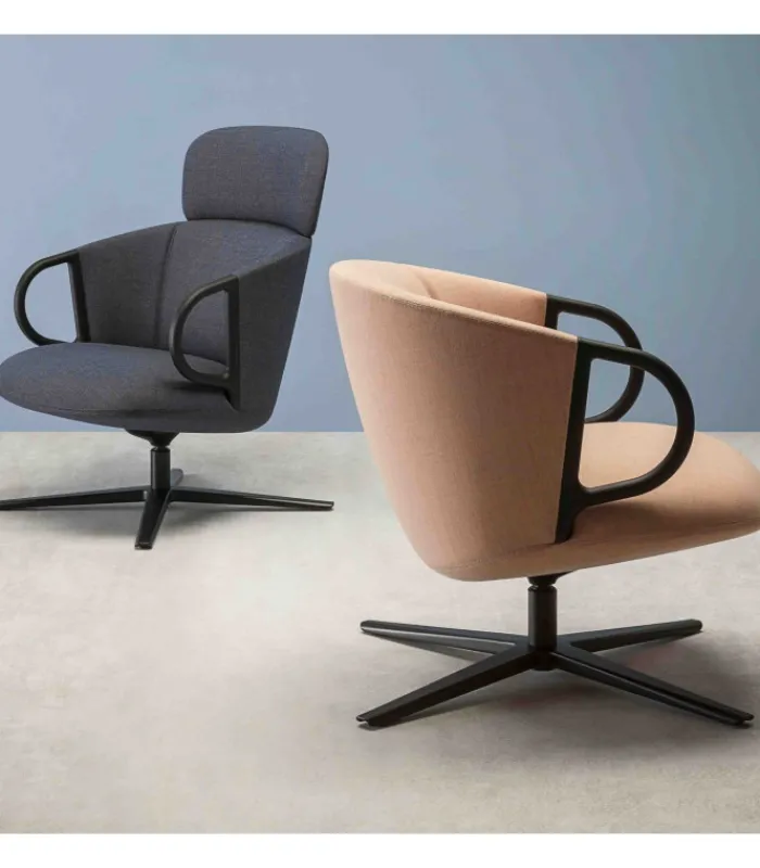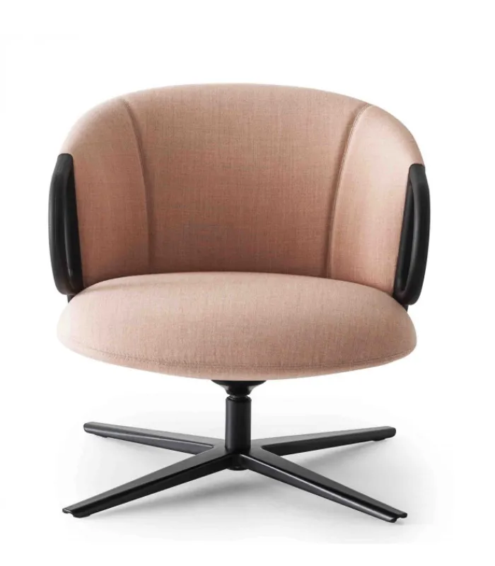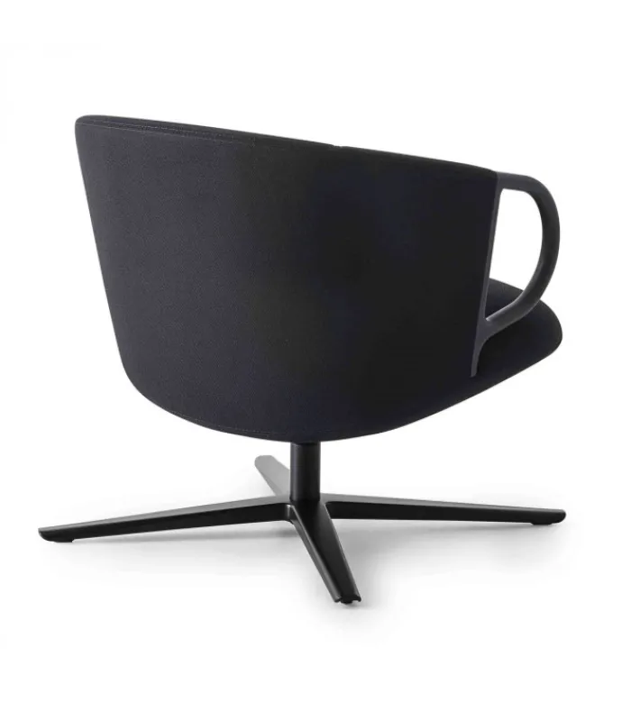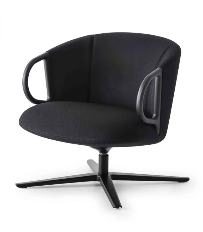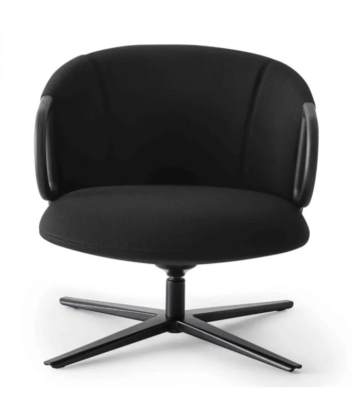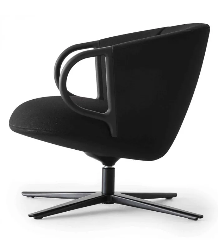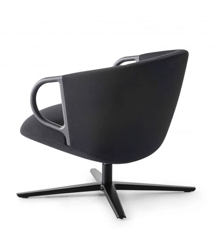 Sedia CUCARACHA LB con meccanismo oscillante e girevole su basamento con 4 razze in alluminio nero, scocca rivestita, con schienale basso.