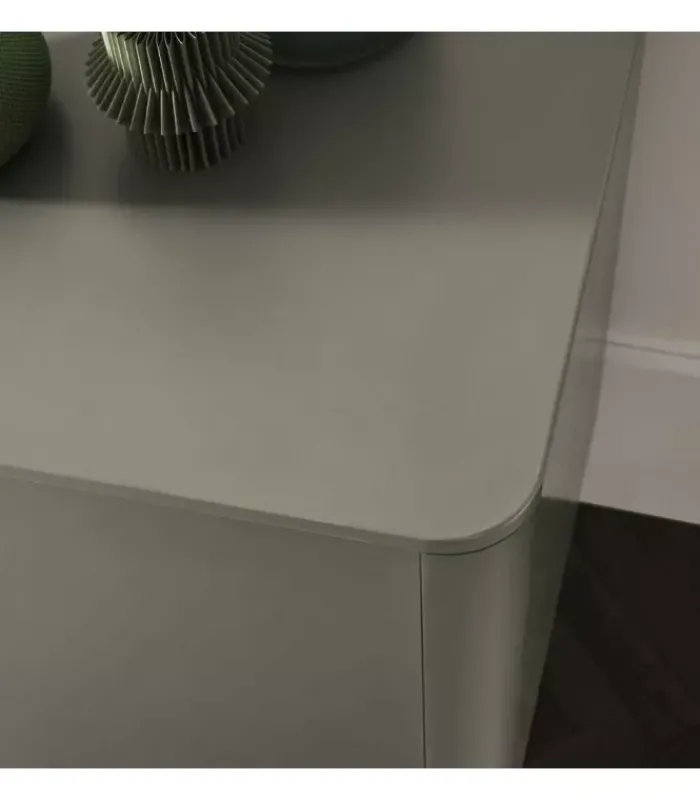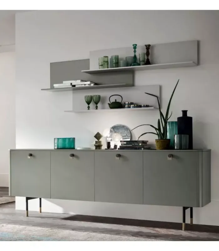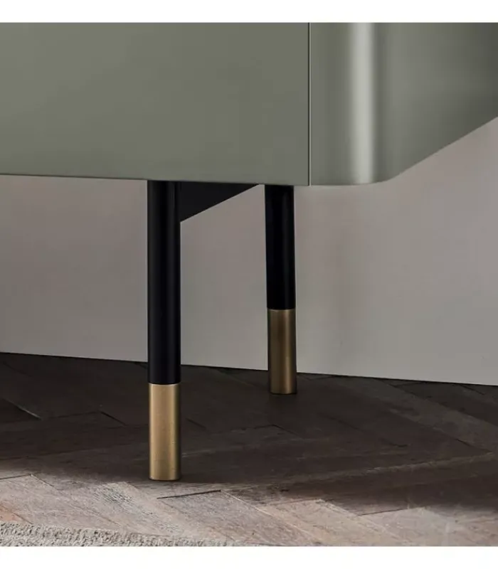Con le sue forme morbide, il colore tenue e i piedini dorati la madia rievoca il design degli anni Settanta per uno stile retrò.