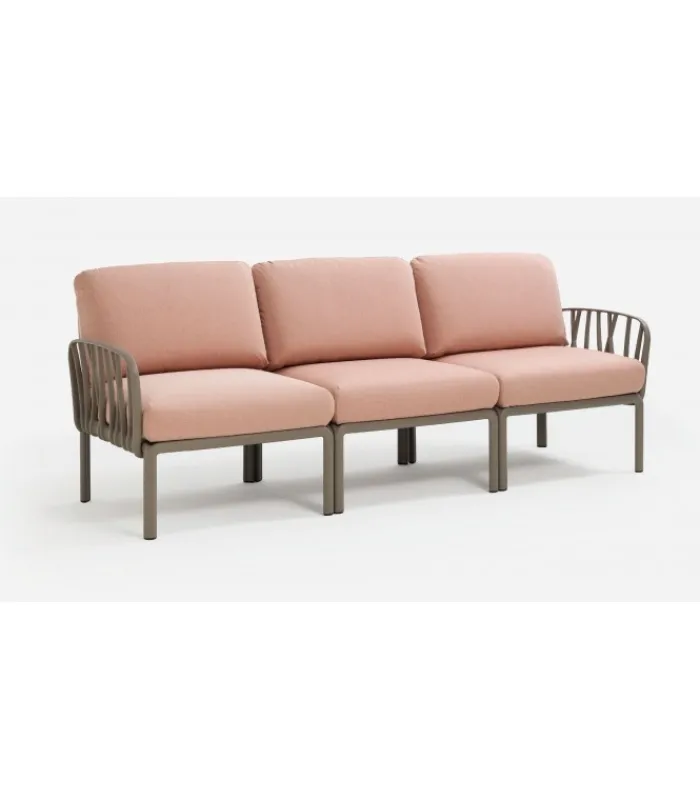 Divano KOMODO 3 POSTI fa parte della serie KOMODO di NARDI ultima novità nell’arredo giardino Made in Italy. KOMODO è un progetto di di Design a cura di Raffaello Galiotto che trae ispirazione dalla natura. La trama ramificata della struttura in polipropilene si materializza attraverso un innovativo sistema di aggancio tra i vari elementi, bracciolo, schienale, e seduta corredati da morbidi cuscini in tessuto trattati per uso esterno.