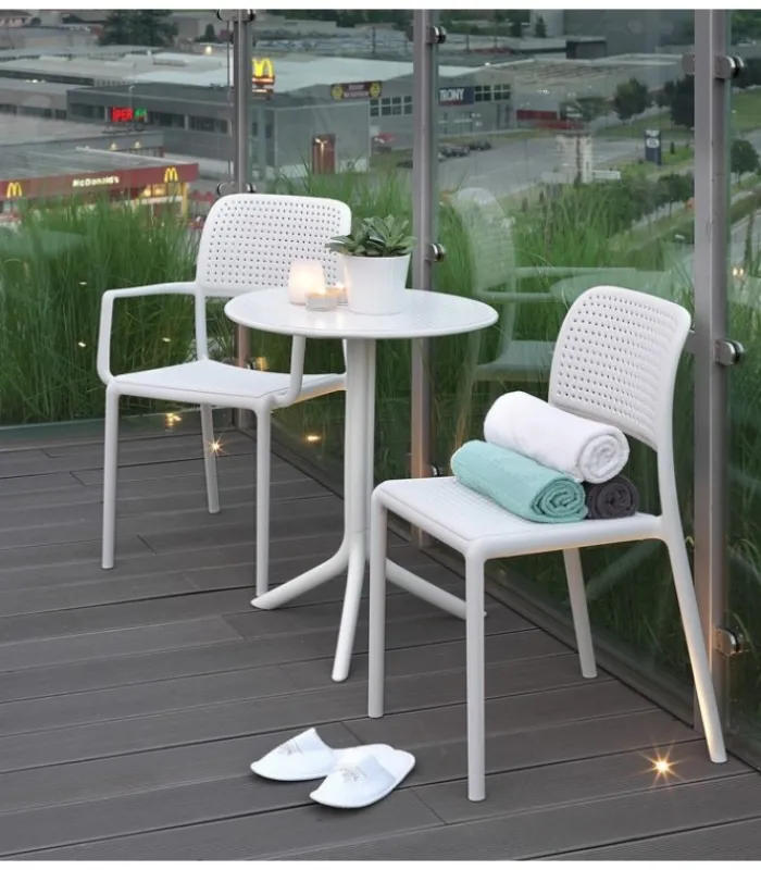 Struttura e piano traforato in polipropilene rinforzato con fibra di vetro, per rendere il prodotto ancora più resistente all’usura e quindi adatto anche a Bar, piscine e contract in generale.