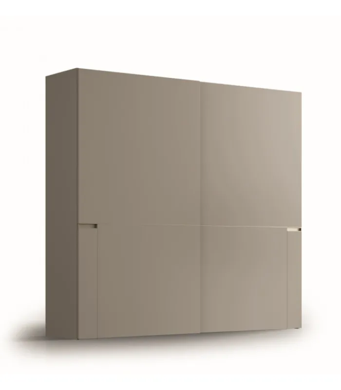 Le linee pulite dell’armadio sono caratterizzate da una particolare maniglia: la sua finitura metallizzata continua nel sottile inserto centrale che attraversa le ante.