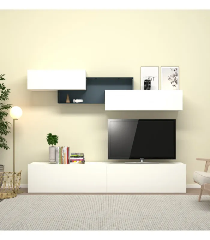 Soggiorno minimal caratterizzato da un libreria centrale in metallo disponibile in 21 modernissimi colori.