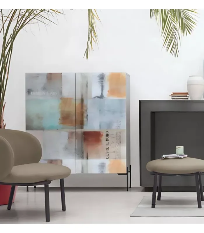 Caratterizzata da uno stile elegante e sofisticato, si distingue per la sua struttura laccata e i frontali in vetro stampato decorato, che donano un tocco di raffinatezza a ogni ambiente.