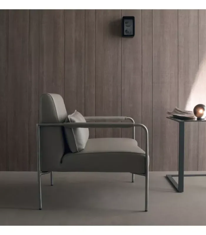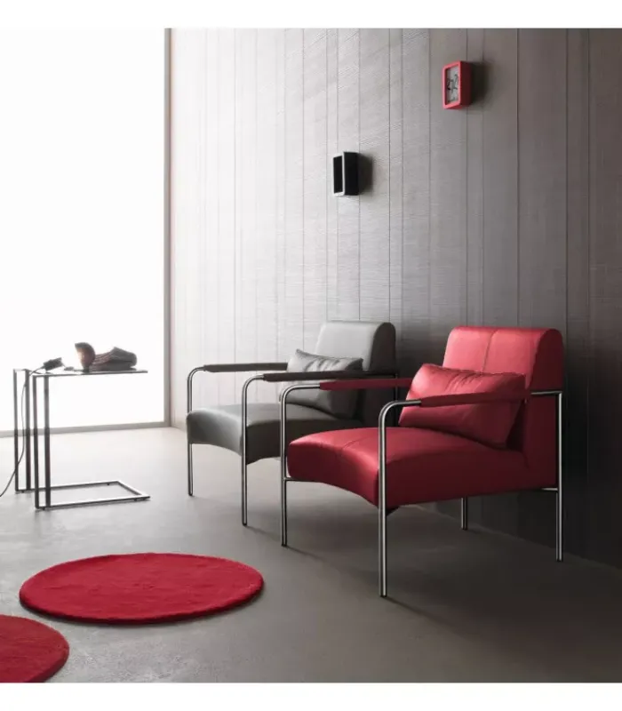 Poltrona con gambe e braccioli in metallo cromato spazzolato, completa di cuscino. Rivestimento disponibile in pelle fucsia, giallo ocra, porpora, bianco, cipria, grigio perla, marmotta o camoscio o in ecopelle bianca, grigio cenere, nera, rossa, gialla o viola. Cuciture in tinta.