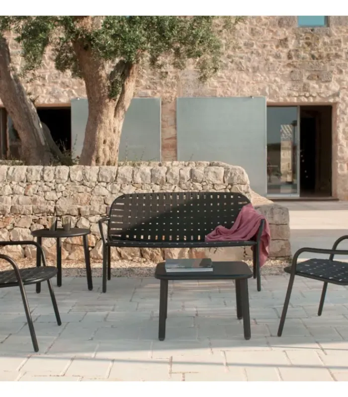 L’intreccio di cinghie elastiche, accoppiate in modo innovativo alla struttura in alluminio dalle linee sofisticate, dá vita ad un insieme dallo stile insolito ed eclettico e dal comfort accentuato, pienamente fruibile per uso esterno. Yard è una linea completa composta da sedia, poltroncina, tavoli fissi, poltrone relax, tavoli bassi di diverse dimensioni e lettino. Completano la collezione tavoli alti di varie misure per ambienti contract e residenziali.