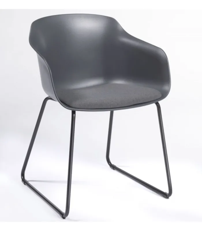 Sedia DAME ST con cuscino tappezzato sulla scocca in tecnopolimero (disponibile in 8 diversi colori). La struttura a slitta è in metallo cromato o verniciato di nero.
