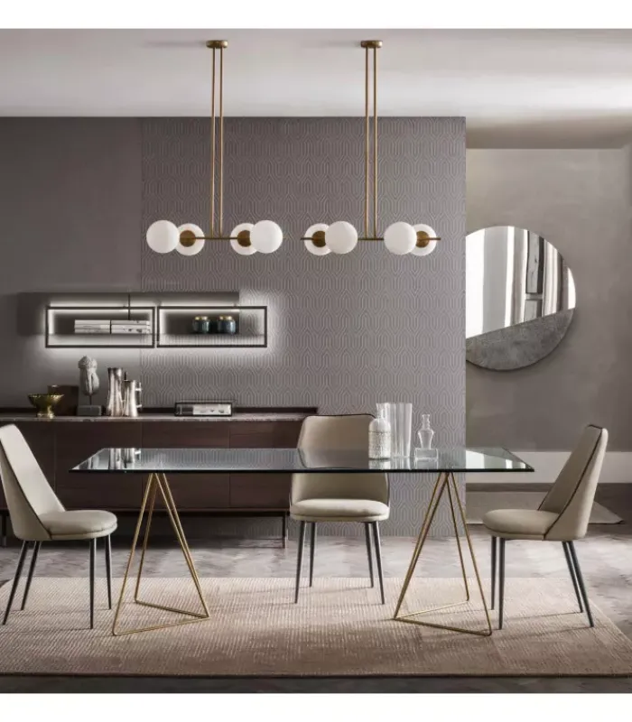 I sottili tondini in metallo disegnano una geometria a triangoli: semplice ma d’effetto per un tavolo moderno.