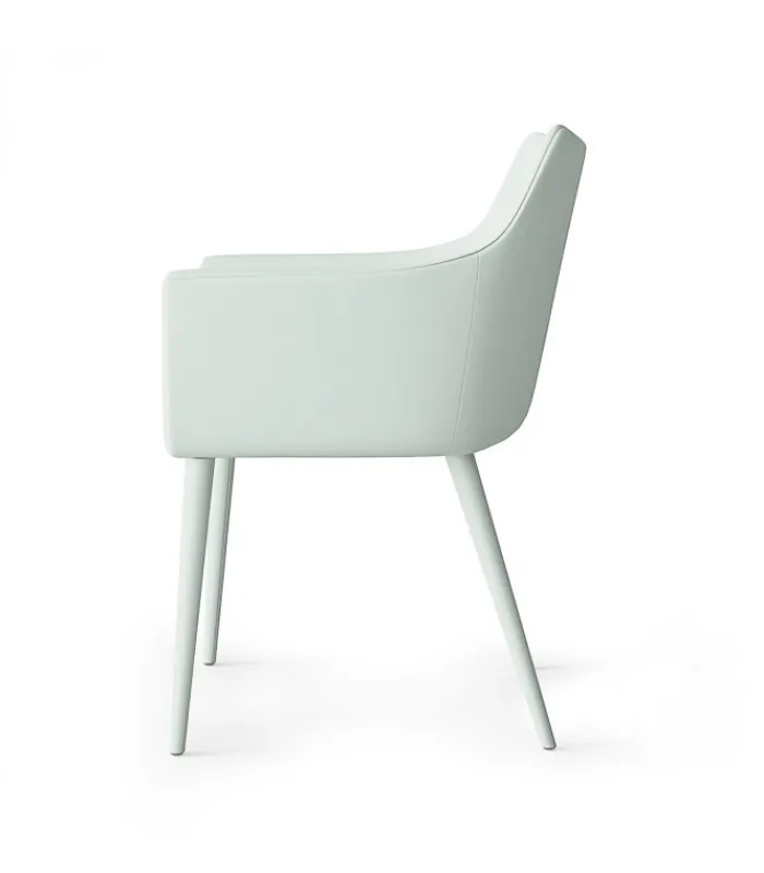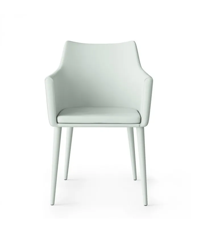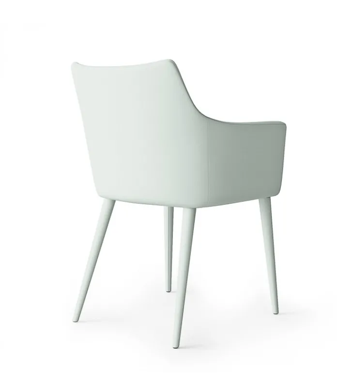 Una sedia dal design accogliente e particolare grazie allo schienale alto e ai braccioli. Tutto disponibile in due tonalità di morbida Ecopelle.