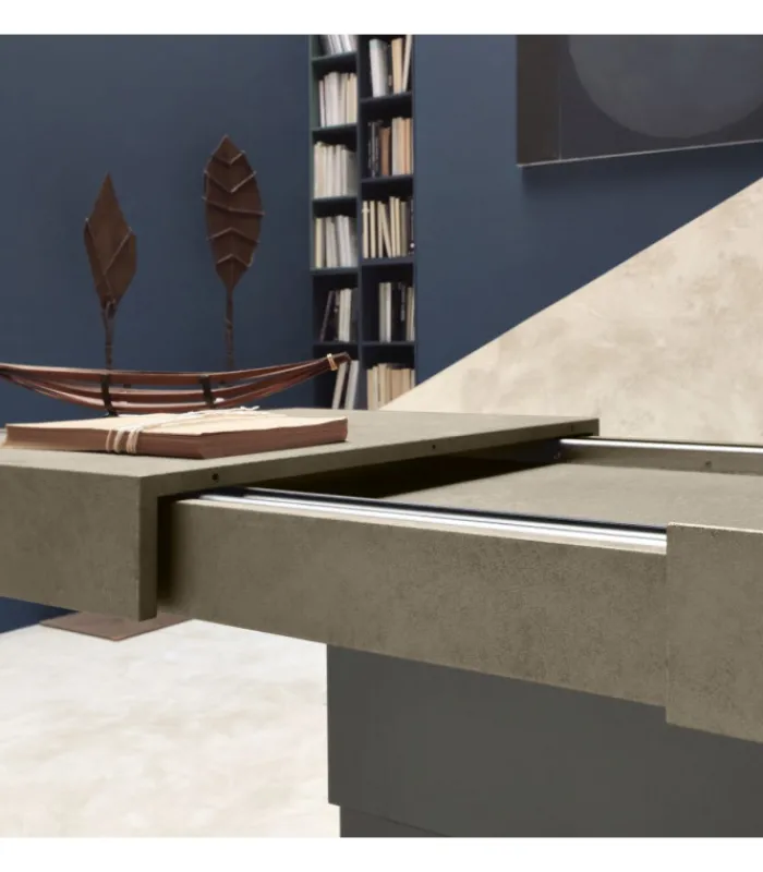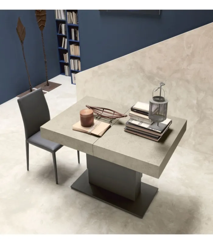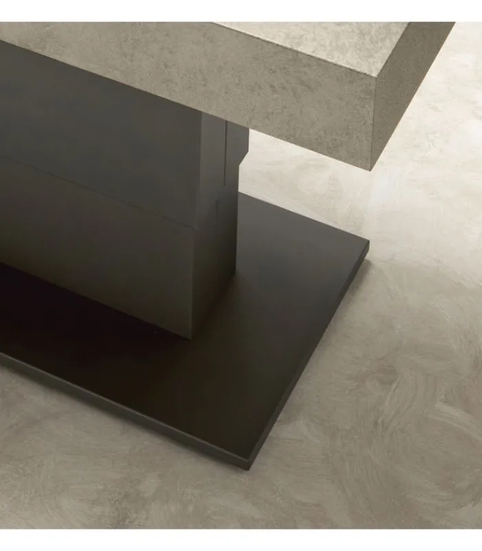 Tavolino trasformabile in tavolo da pranzo, struttura centrale in acciaio, meccanismo a gas, regolabile in altezza al millimetro da cm 41 a cm 82, piano rettangolare in nobilitato, laccato, legno o effetto malta. Apertura sincronizzata con 2 prolunghe interne. Rotelle piroettanti a scomparsa.